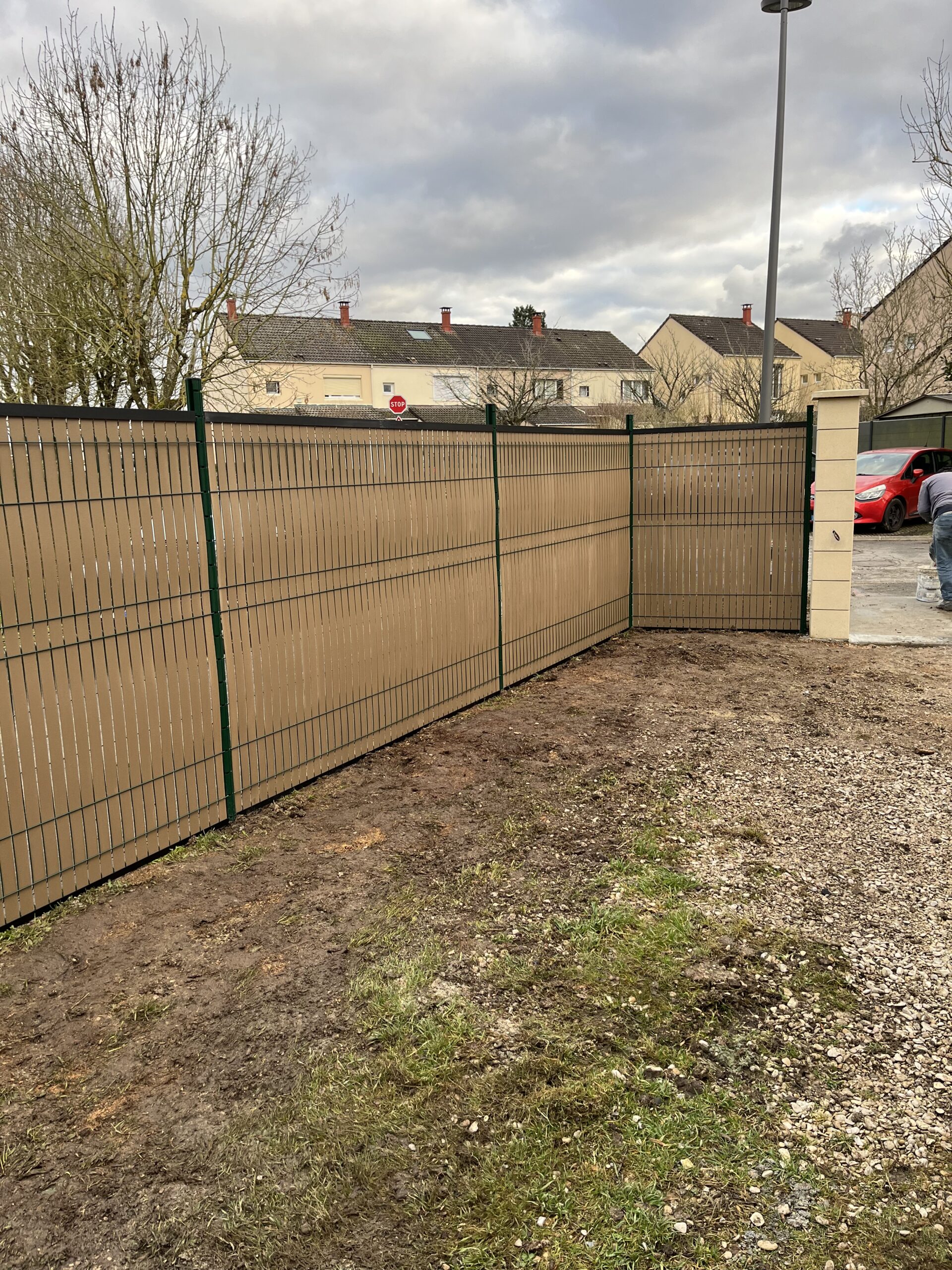 • Les Panneaux Rigides avec Lames Brise-Vue Composite Coloris Bois : Nous avons installé des panneaux de clôture rigides équipés de lames brise-vue en composite imitation bois. Ce choix esthétique offre l’apparence chaleureuse et authentique du bois naturel tout en bénéficiant des avantages du composite : résistance exceptionnelle aux intempéries, aucun entretien nécessaire, imputrescibilité et stabilité dimensionnelle. Les lames brise-vue créent un écran visuel efficace préservant totalement l’intimité de la propriété, tout en laissant passer l’air naturellement.