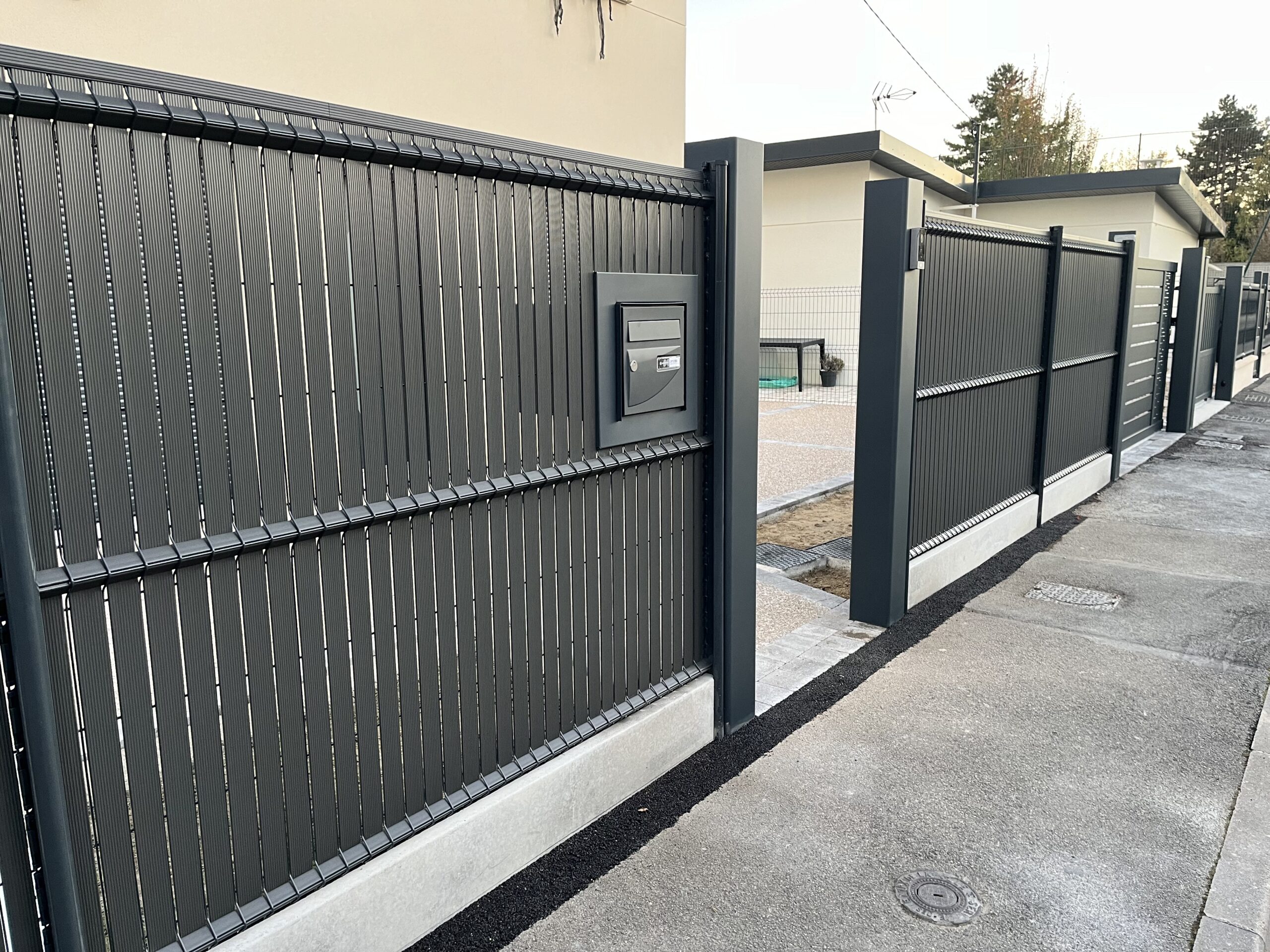 • Lames Occultantes en PVC : Pour garantir l’intimité de la propriété, nous avons intégré des lames occultantes en PVC de qualité supérieure. Ces lames, insérées dans le grillage rigide, créent un écran visuel efficace tout en permettant une aération naturelle. Le PVC offre l’avantage d’être imputrescible, résistant aux UV et facile d’entretien, conservant durablement sa couleur et son aspect.