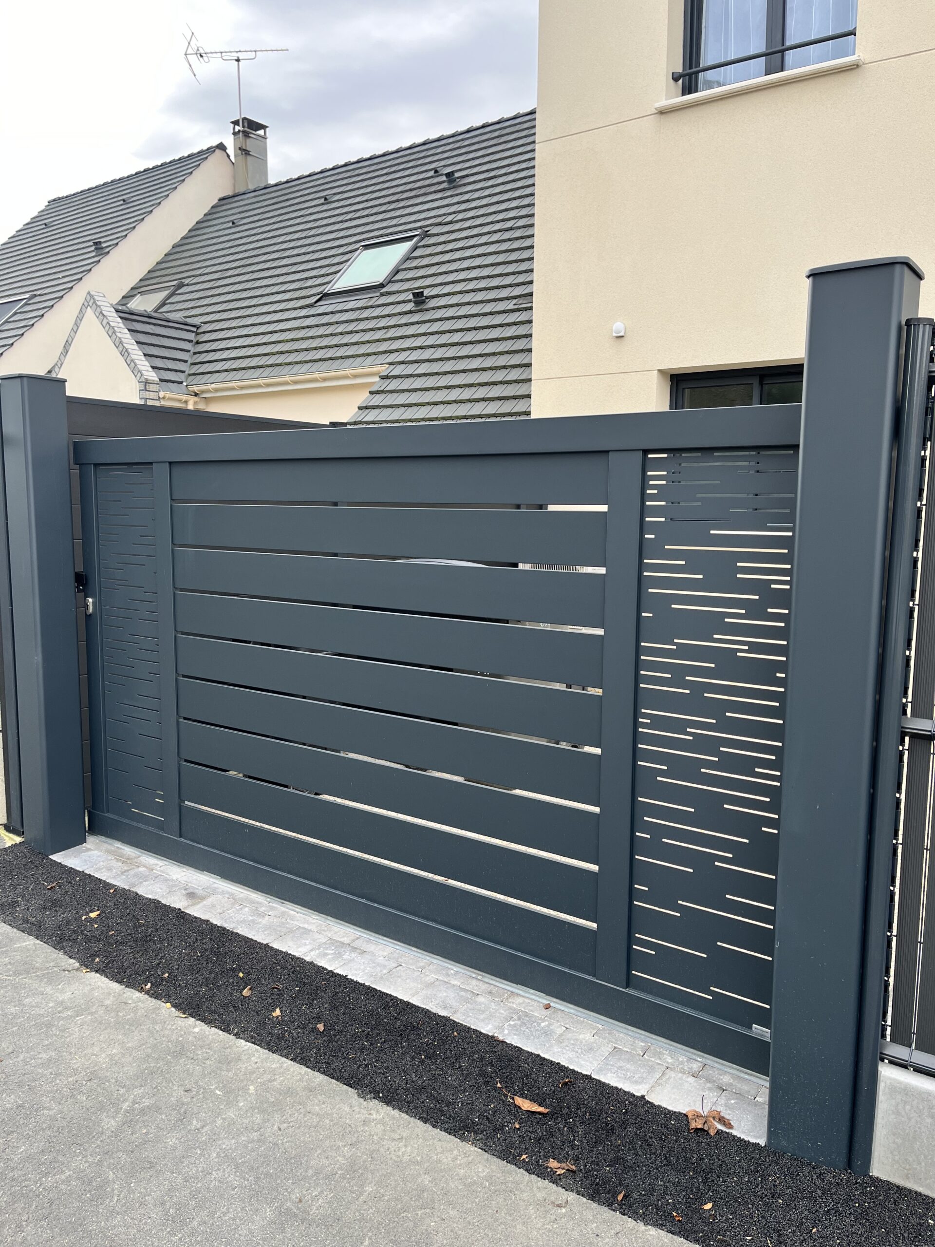 • Portail Coulissant et Portillon en Aluminium Motorisés : Nous avons fourni et posé un portail coulissant et un portillon en aluminium gris, assortis au reste de la clôture pour une parfaite harmonie visuelle. L’installation inclut une motorisation Somfy haut de gamme et une gâche électrique pour le portillon, offrant confort, sécurité et modernité. Le système Somfy permet une ouverture à distance via télécommande ou smartphone, tandis que la gâche électrique sécurise l’accès piéton.
