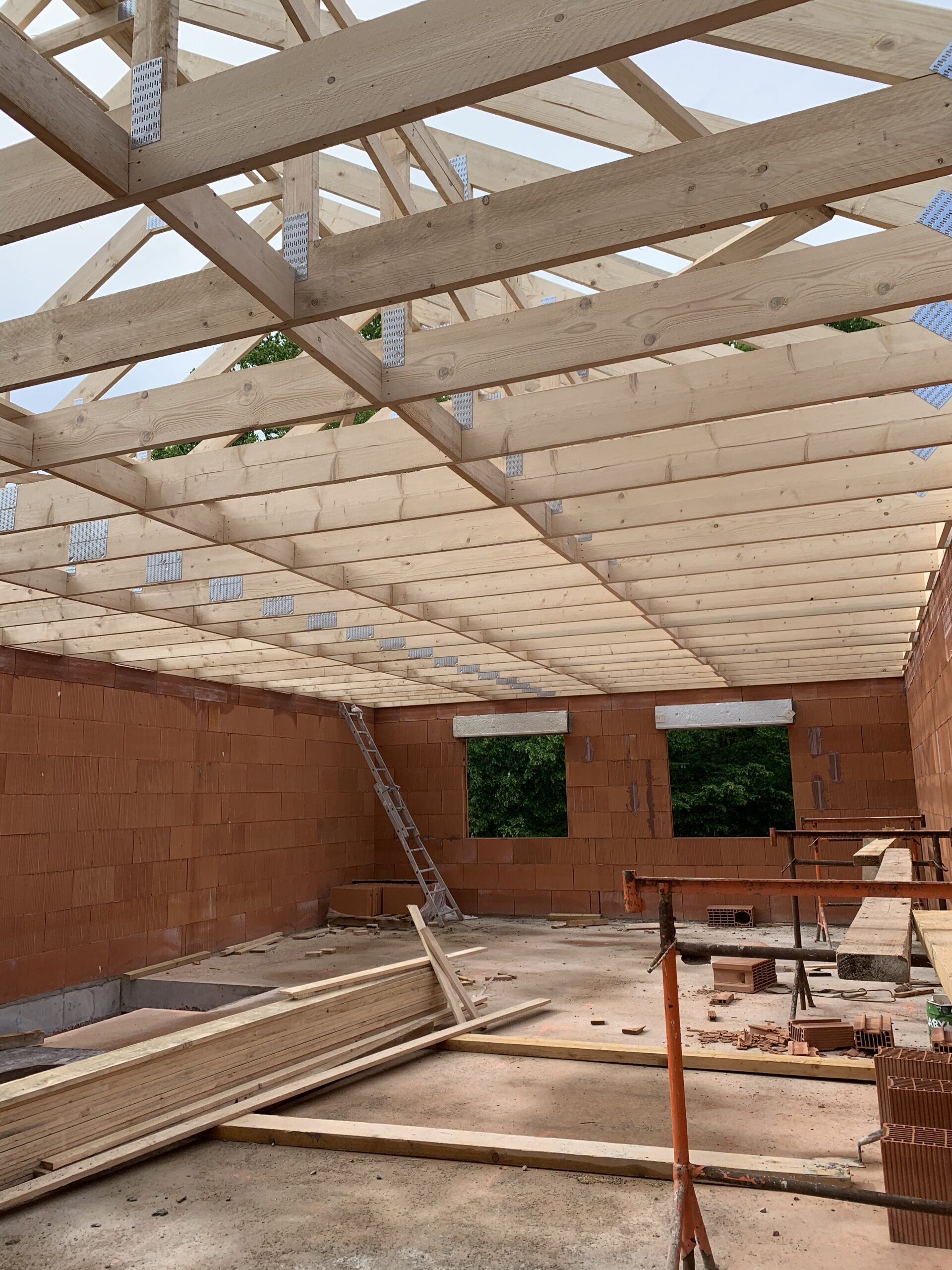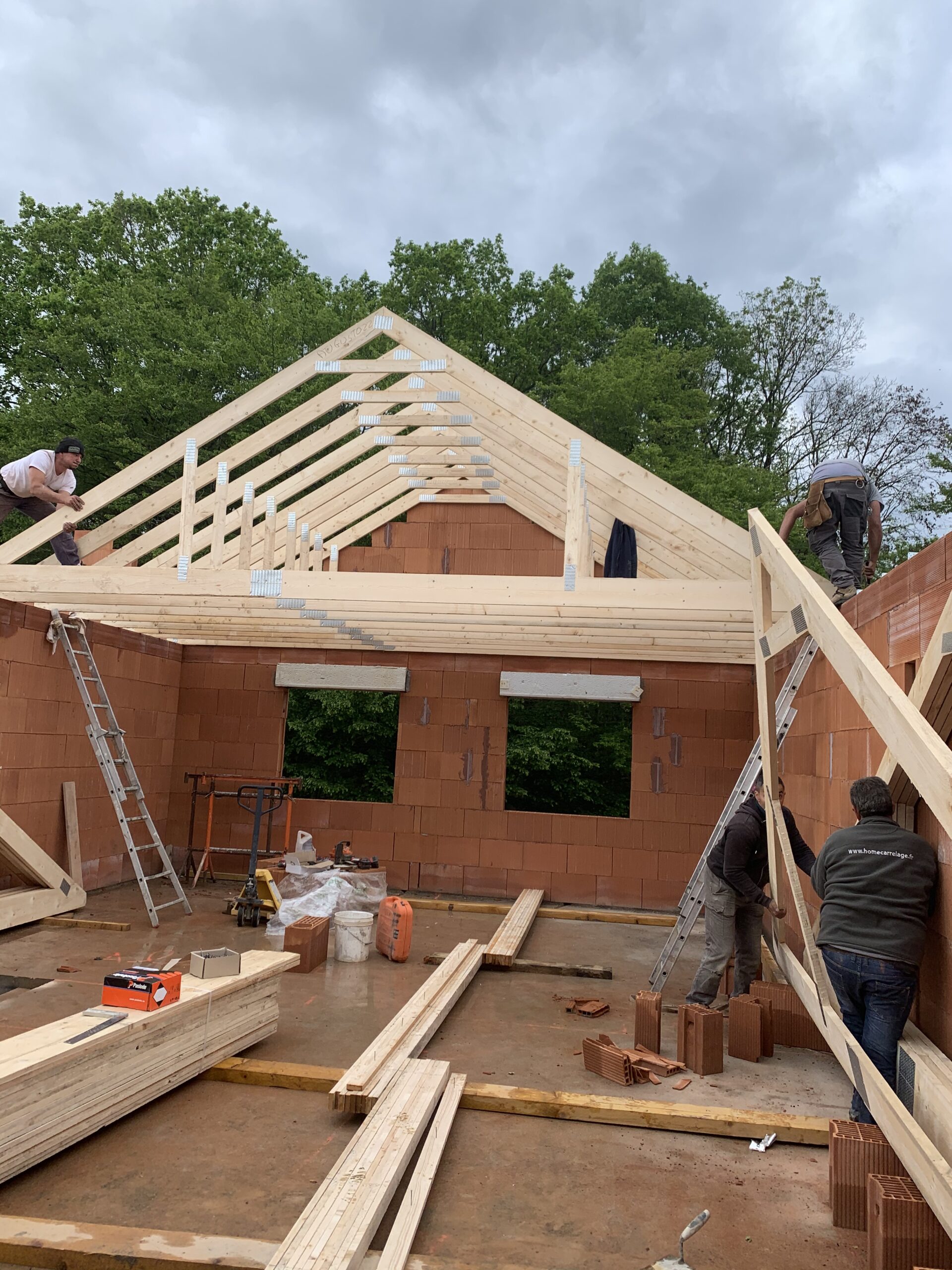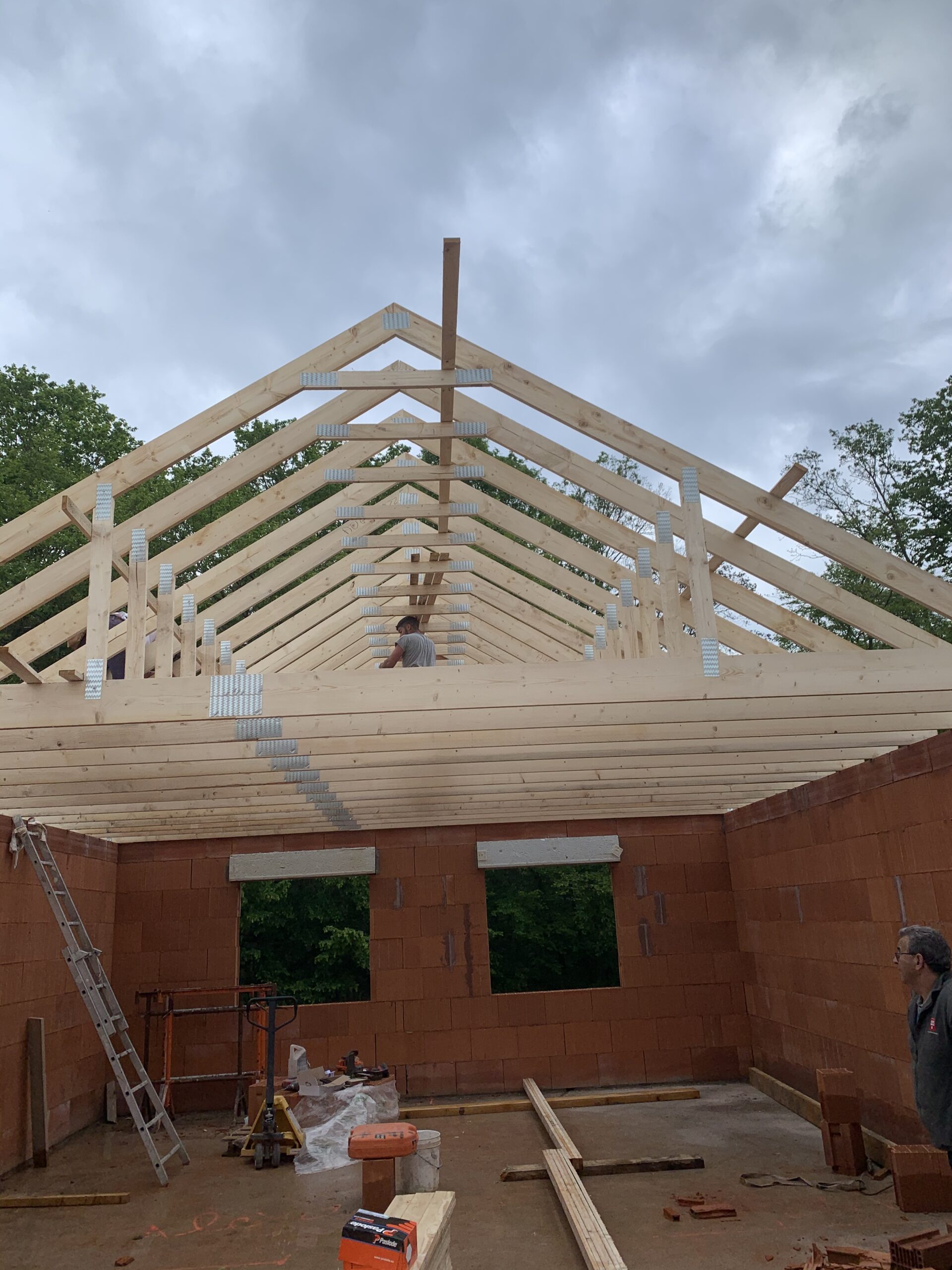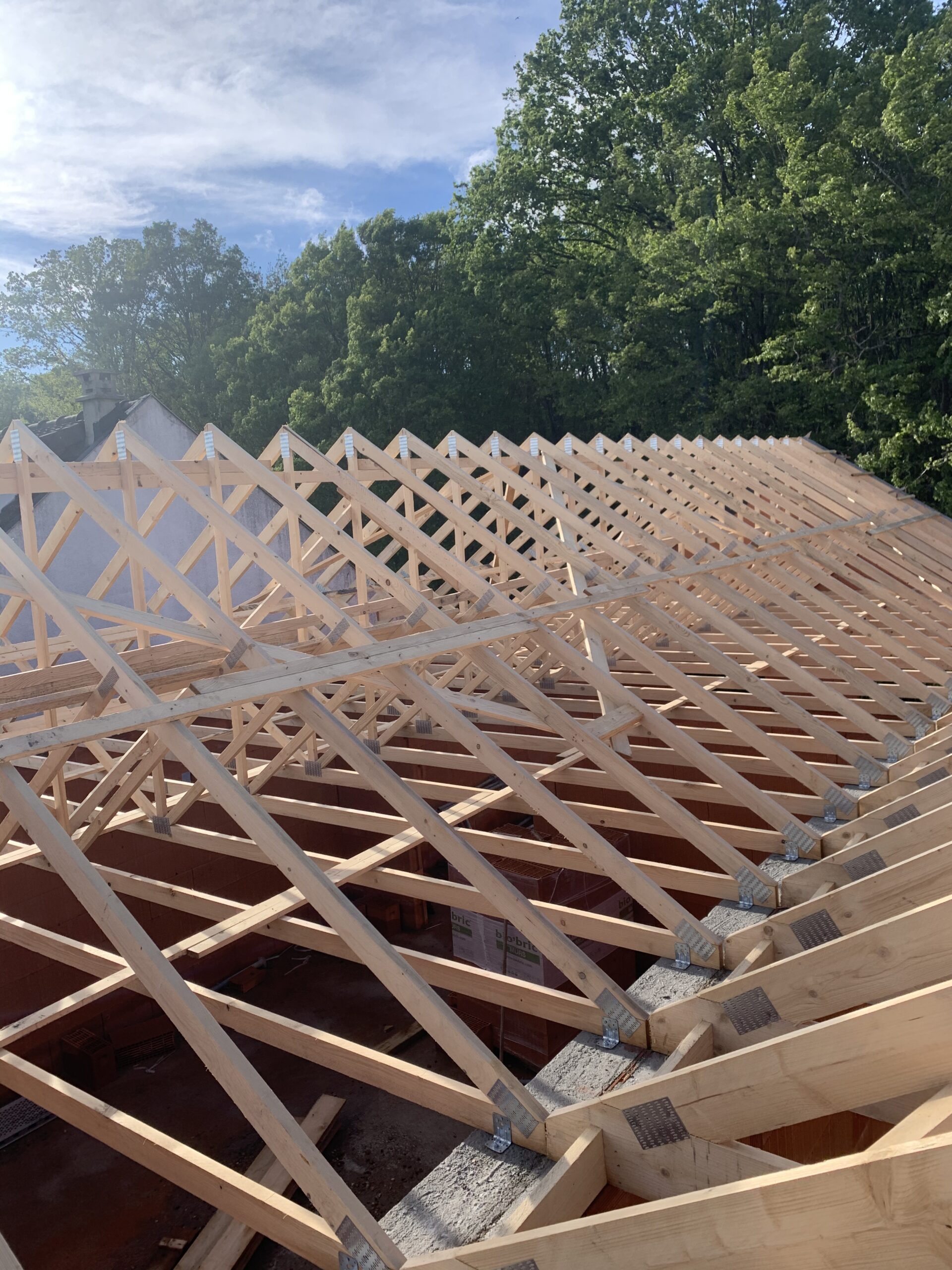 Le Projet : Notre mission était de réaliser l’intégralité de la couverture d’une maison neuve, incluant la pose de la charpente, l’étanchéité sous toiture et la couverture finale en tuiles. Ce type de projet nécessite une expertise technique pointue en charpente et couverture, le respect strict des normes de construction, ainsi qu’une coordination parfaite entre les différentes étapes pour garantir une toiture durable et performante pour les décennies à venir.