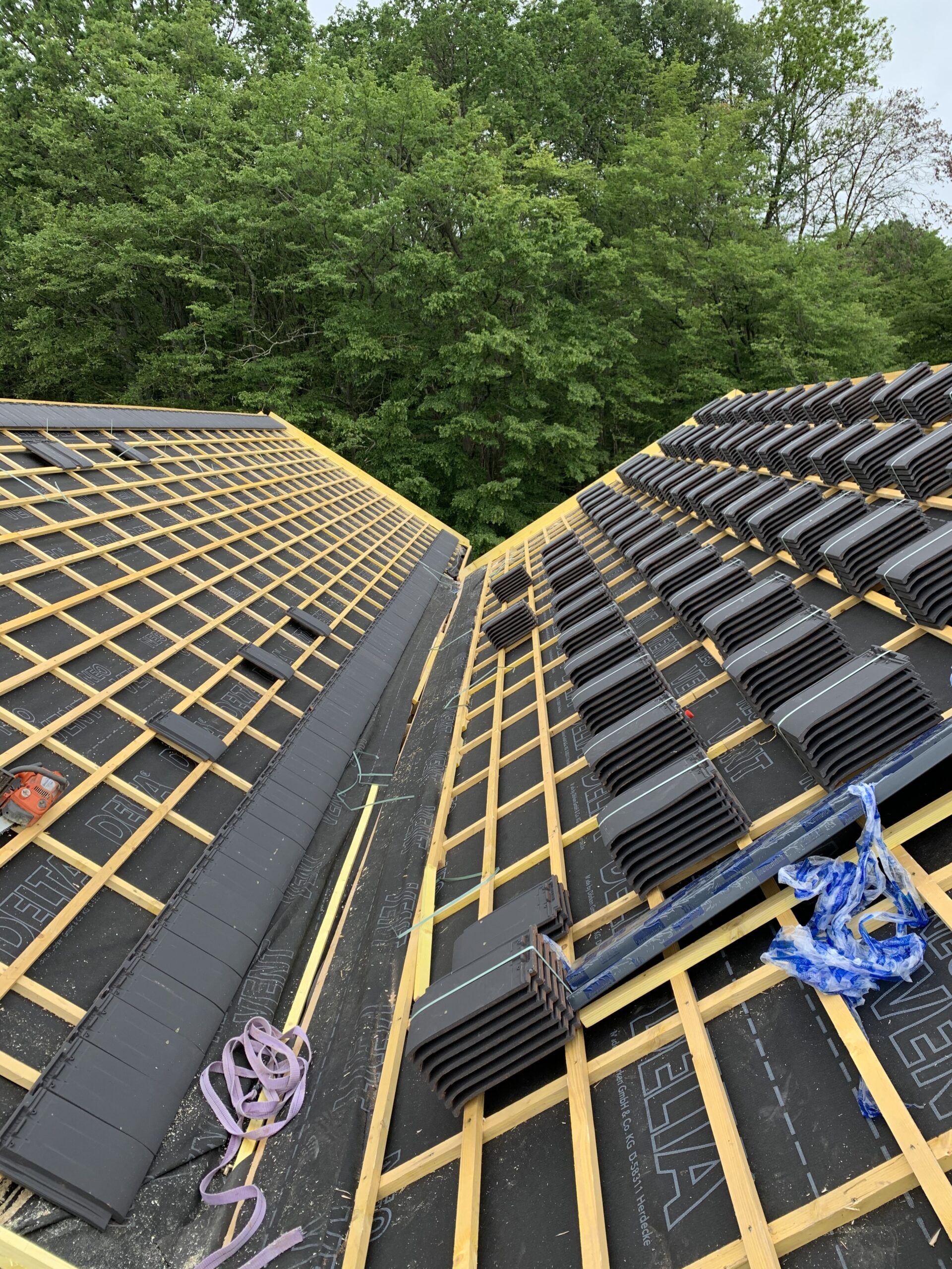 - La Couverture en Tuiles HP17 Gris Anthracite : Nous avons fourni et posé des tuiles HP17 (Huguenot Plat 17) en coloris gris anthracite, un modèle de tuile béton reconnu pour sa robustesse et son esthétique contemporaine. Le gris anthracite apporte une touche moderne et élégante qui s’harmonise parfaitement avec les styles architecturaux actuels. La pose inclut l’ensemble des accessoires nécessaires : faîtière, rives, chatières de ventilation et closoirs, garantissant une finition parfaite et une étanchéité totale de la toiture.