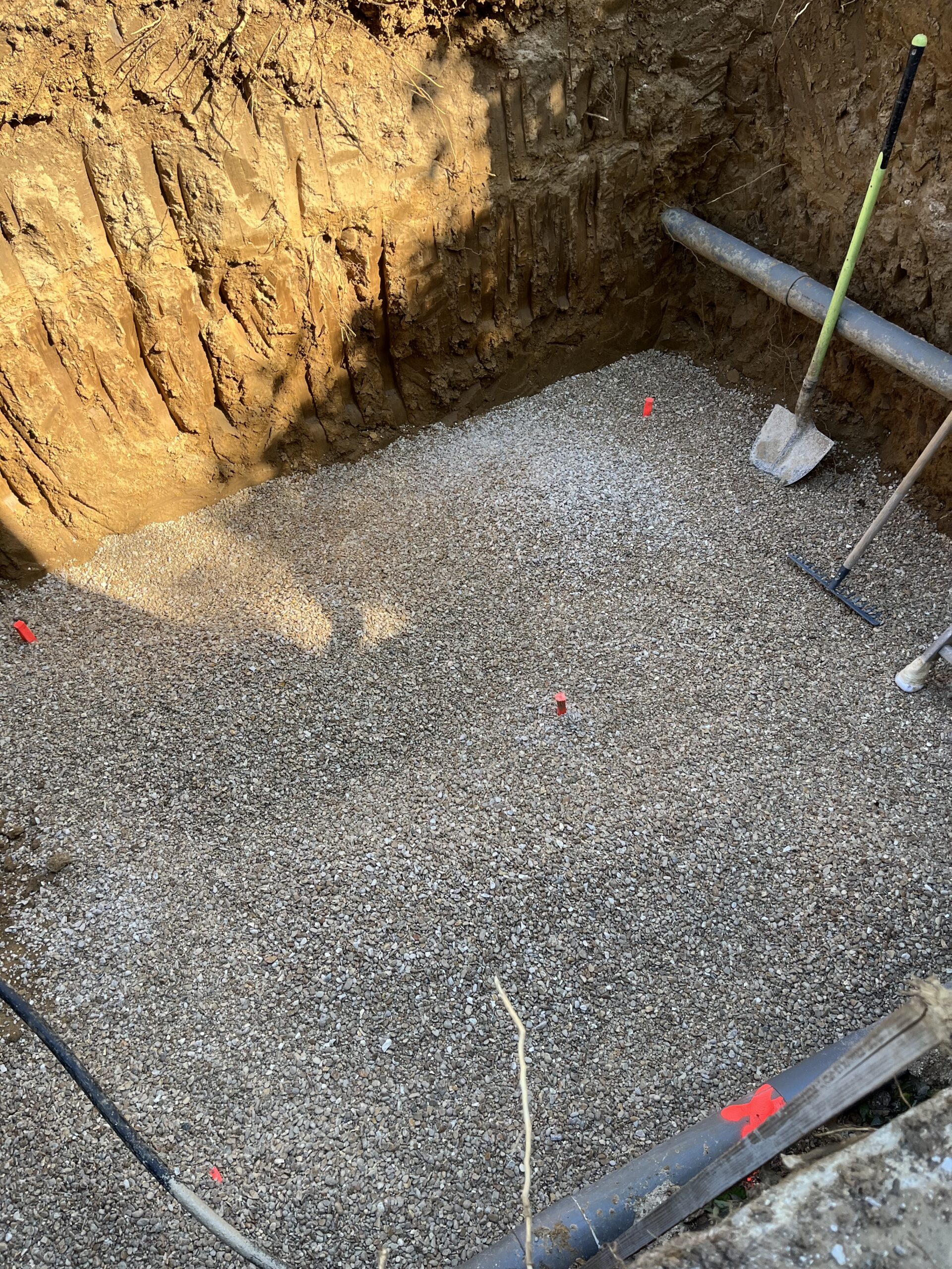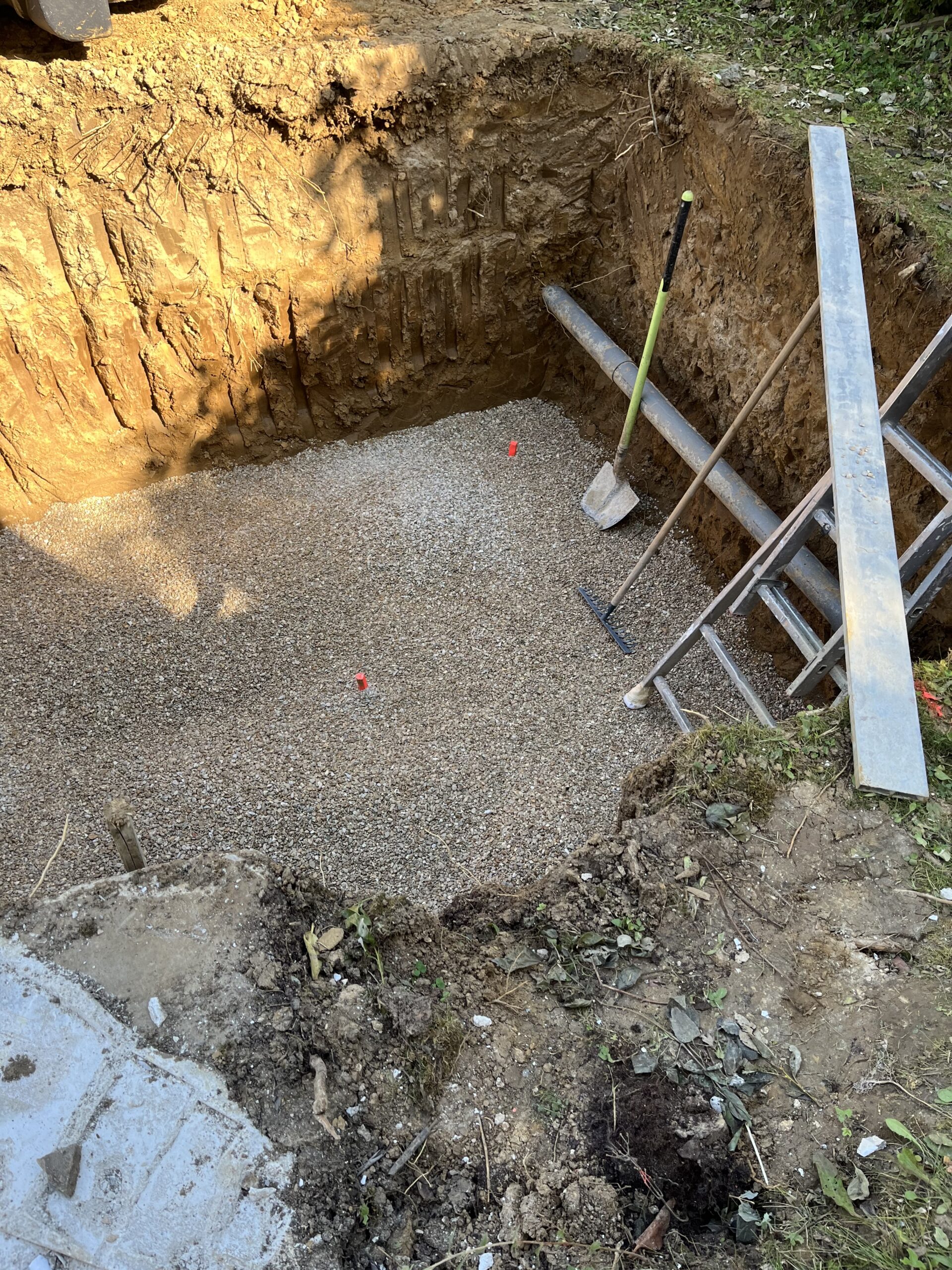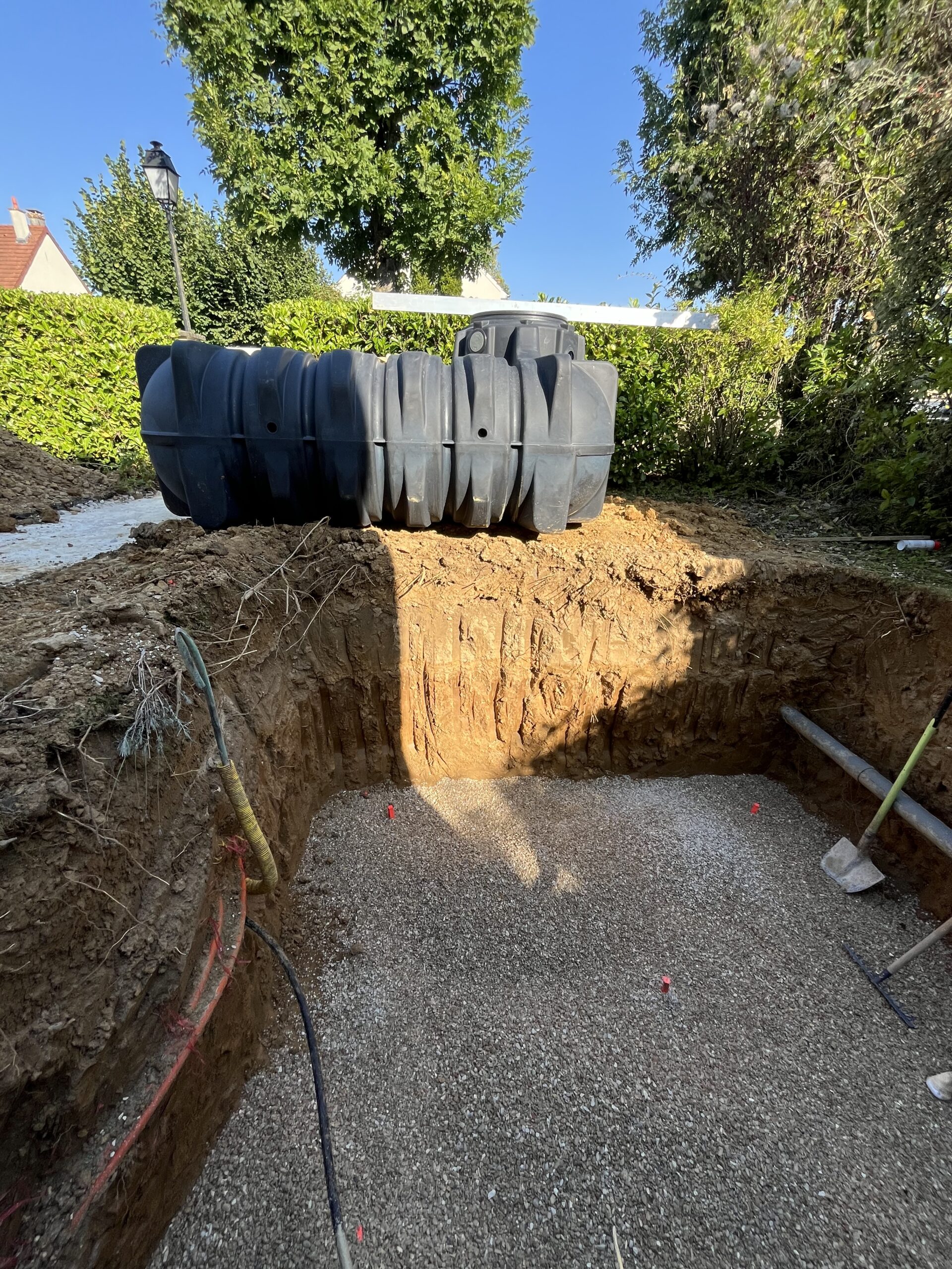 • Le Terrassement : Nous avons réalisé un terrassement précis aux dimensions exactes de la cuve extra-plate de 5000 litres. Cette étape cruciale nécessite une préparation minutieuse du terrain pour assurer la stabilité et la pérennité de l’installation. Le choix d’une cuve extra-plate permet une intégration discrète sous le jardin tout en maximisant la capacité de stockage.