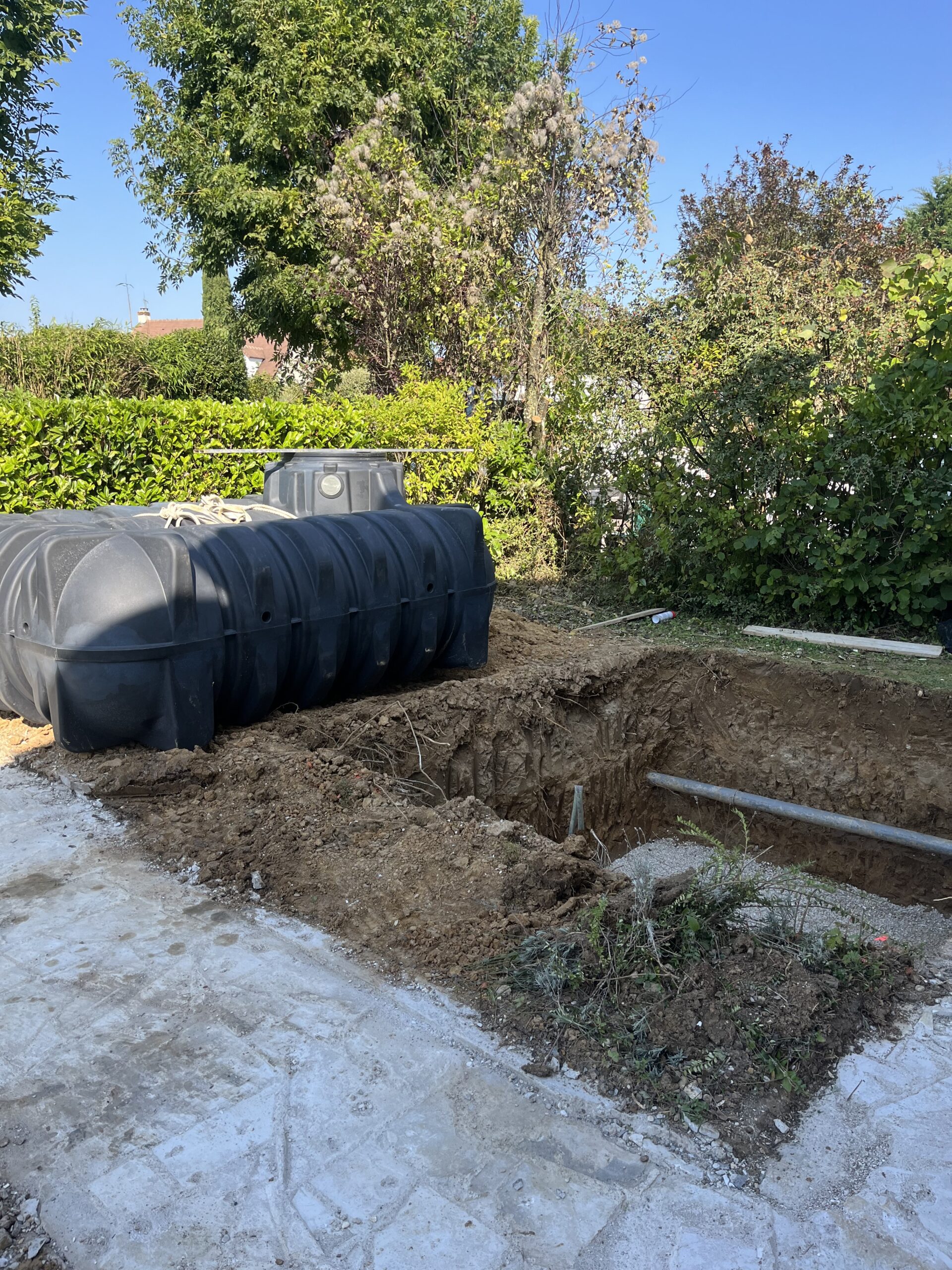 • L’Installation et la Finition : Après la fourniture et la pose de la cuve extra-plate de 5000 litres, nous avons procédé au remblaiement soigné, restaurant l’espace extérieur dans son état d’origine. L’installation est ainsi totalement invisible, préservant l’esthétique de votre jardin.