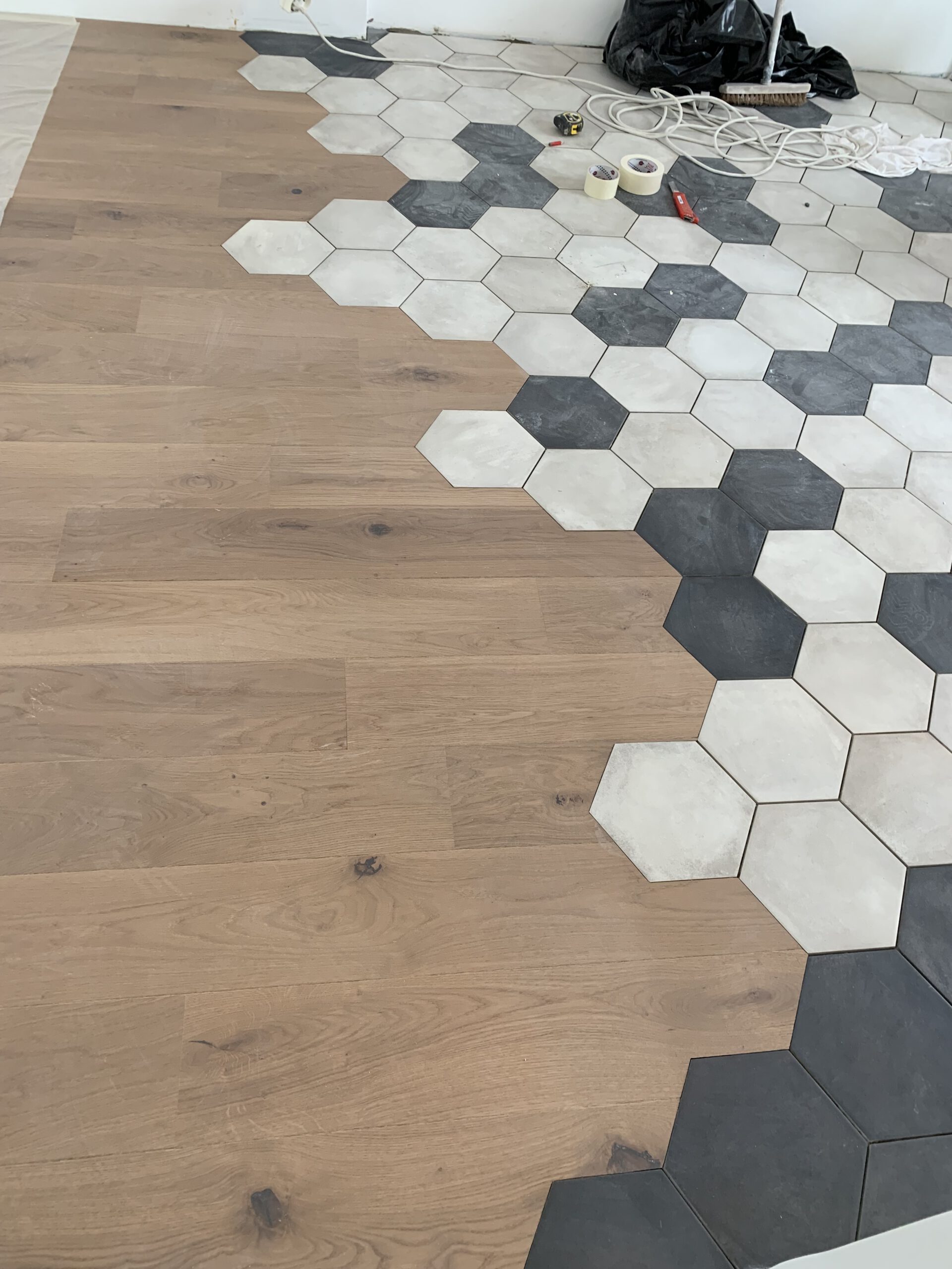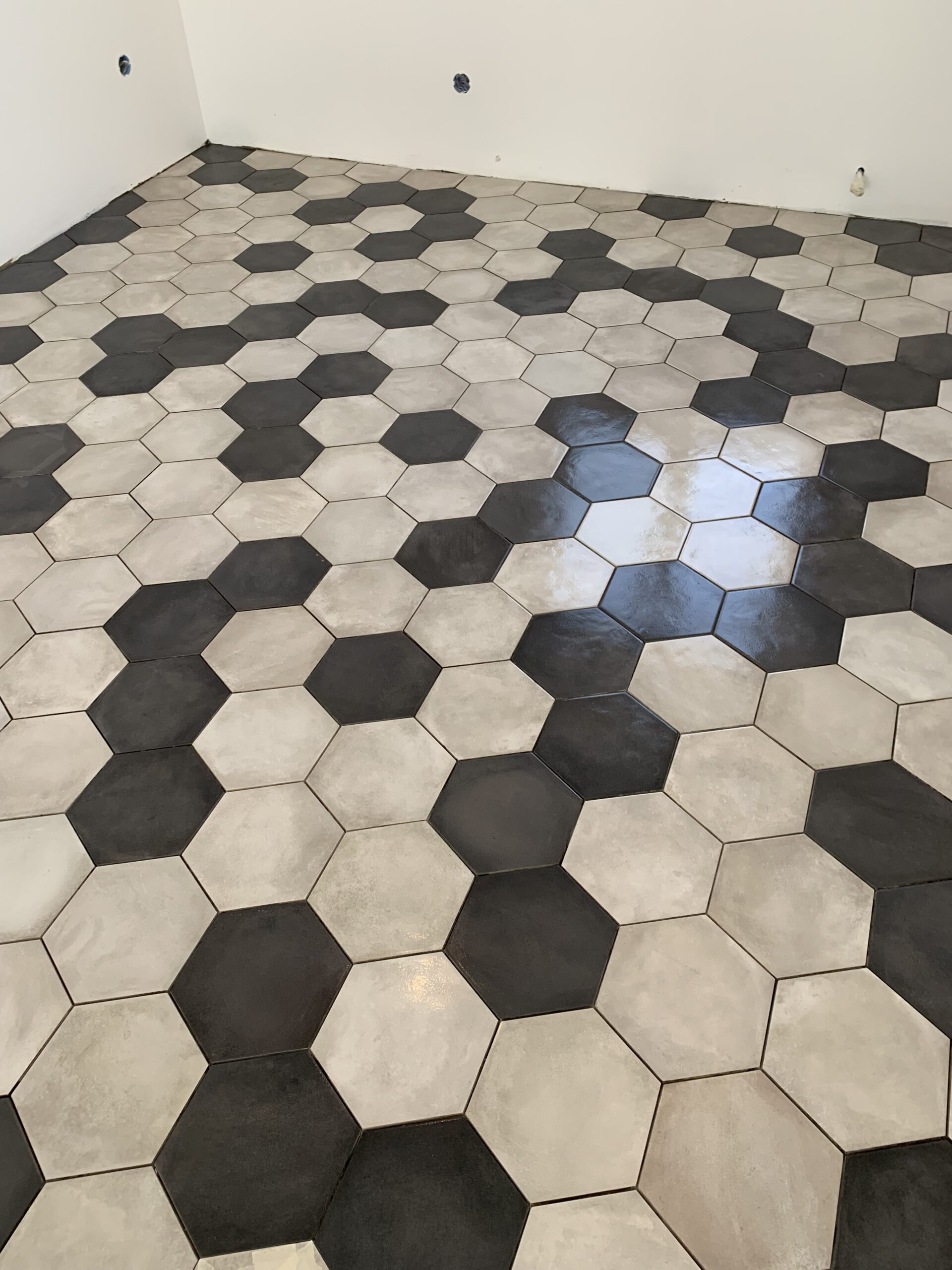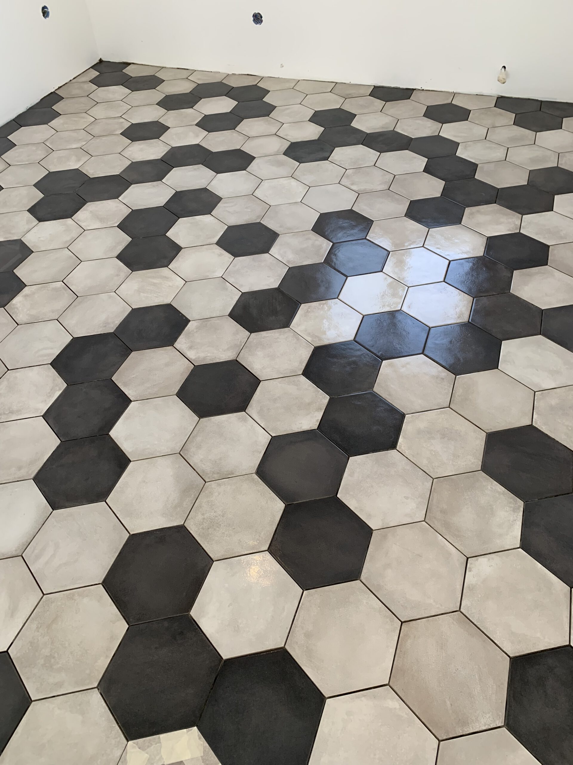 Notre choix de carrelage hexagonal, dans des nuances de gris, apporte une touche de modernité et de style durable. Chaque pièce a été posée avec une précision méticuleuse pour former un motif géométrique captivant, facile d’entretien et résistant aux passages fréquents.
