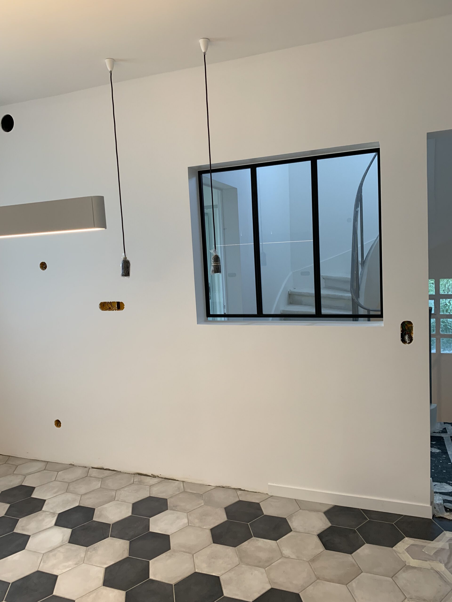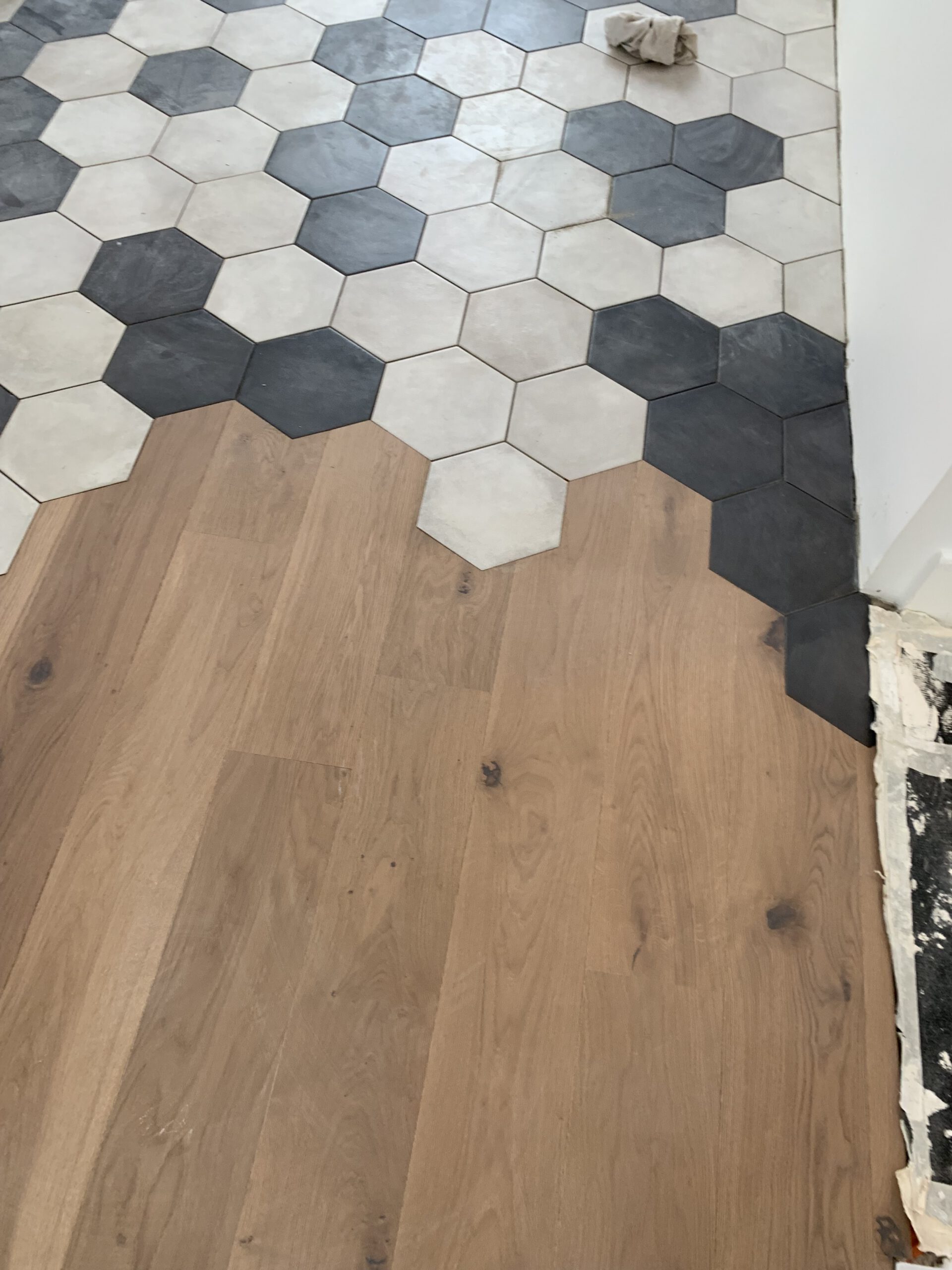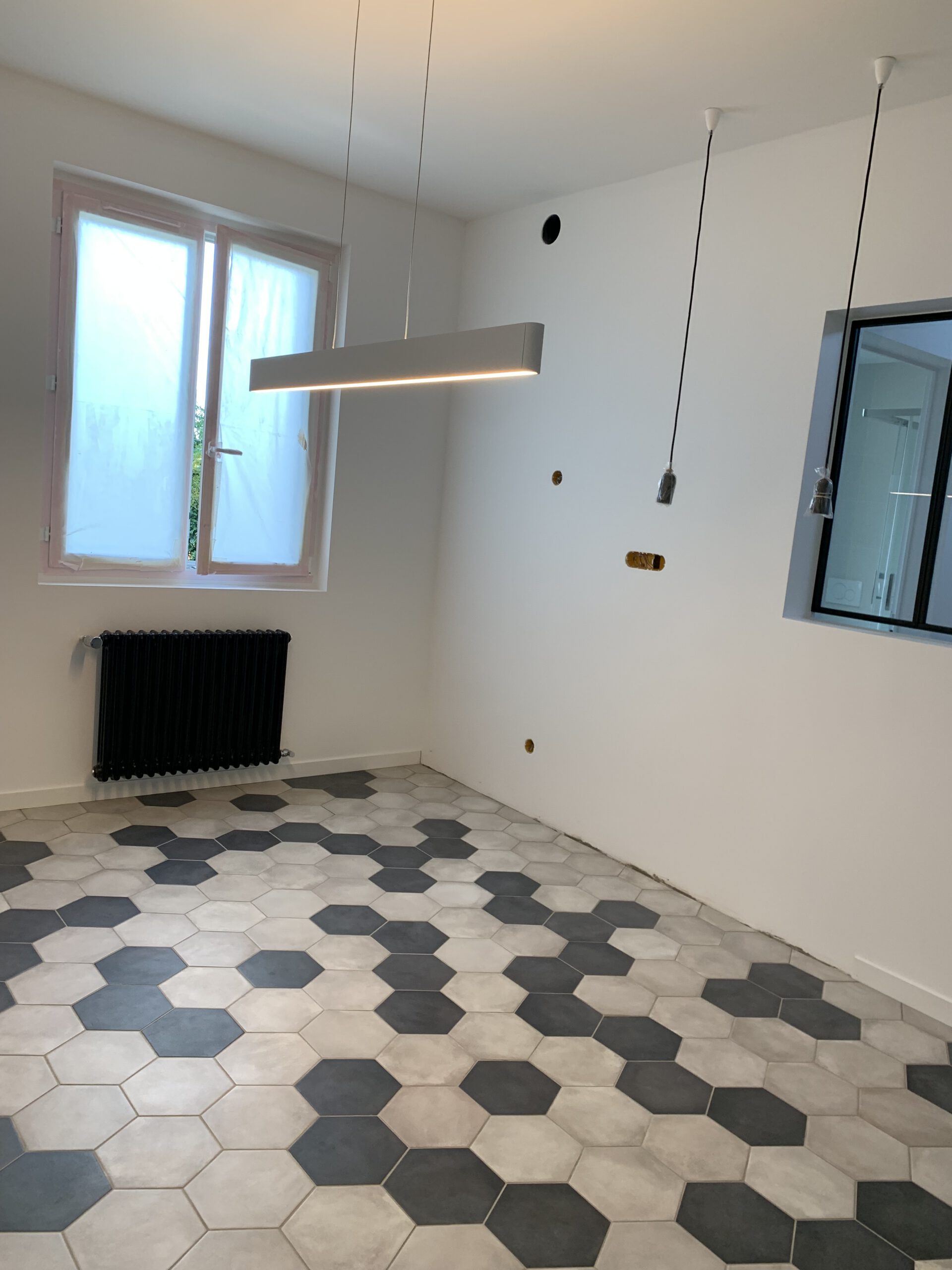 Notre choix de carrelage hexagonal, dans des nuances de gris, apporte une touche de modernité et de style durable. Chaque pièce a été posée avec une précision méticuleuse pour former un motif géométrique captivant, facile d’entretien et résistant aux passages fréquents.