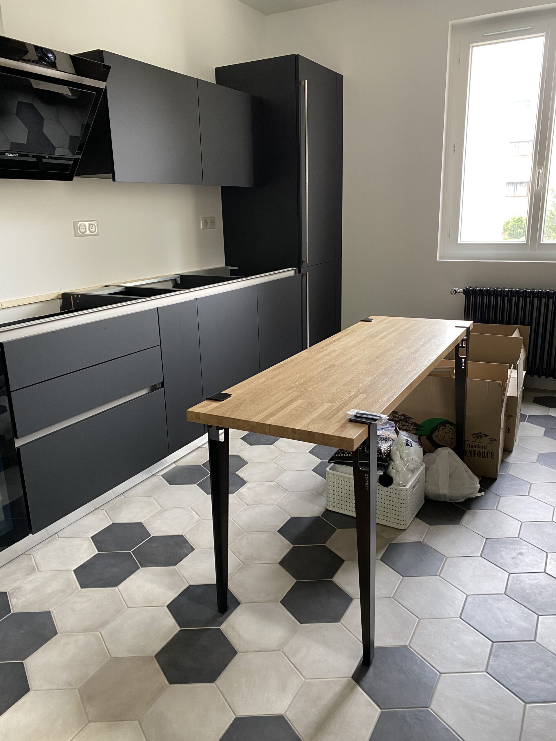 La récente rénovation de cette cuisine présente une alliance parfaite entre le caractère authentique du parquet en bois de chêne et l’aspect contemporain du carrelage hexagonal. Cette fusion de matériaux n’est pas seulement un choix esthétique mais répond également à des critères de fonctionnalité, en délimitant les espaces de vie sans compromettre la fluidité de l’ensemble.