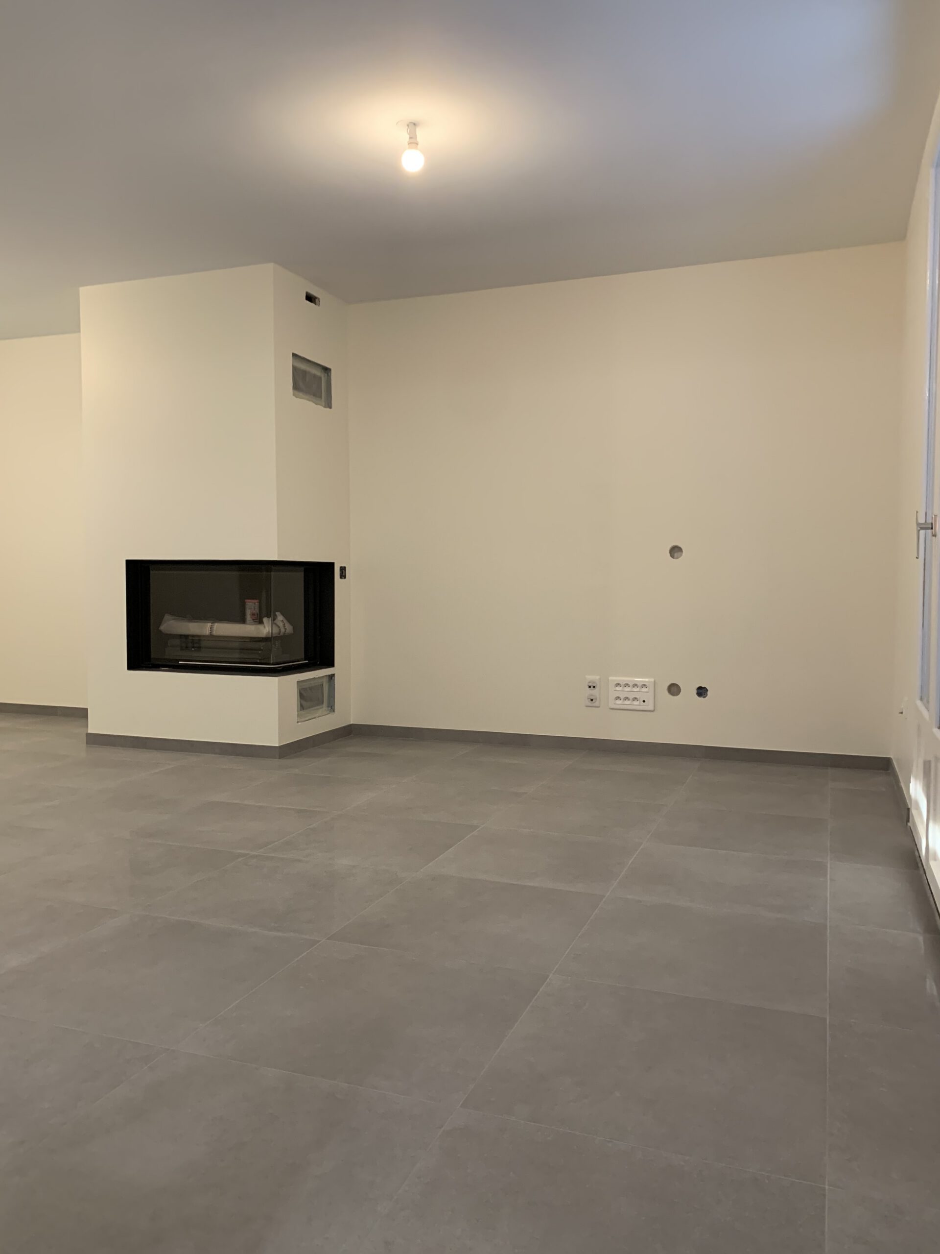 Le point central de ce rez-de-chaussée rénové est le foyer moderne encastré, qui crée non seulement un point focal impressionnant mais offre aussi une source de chaleur et de confort. Il s’harmonise avec les lignes épurées et les couleurs contemporaines de la pièce.