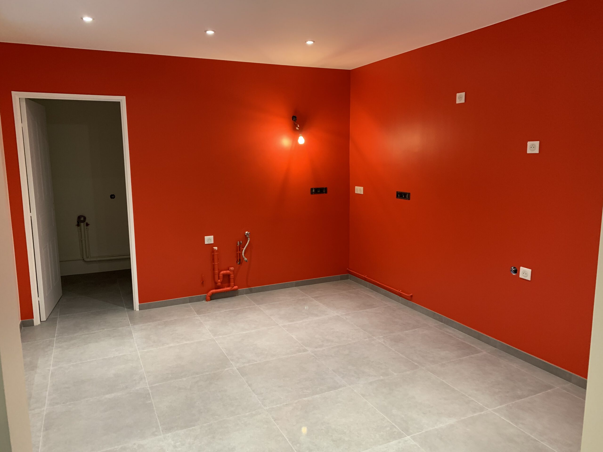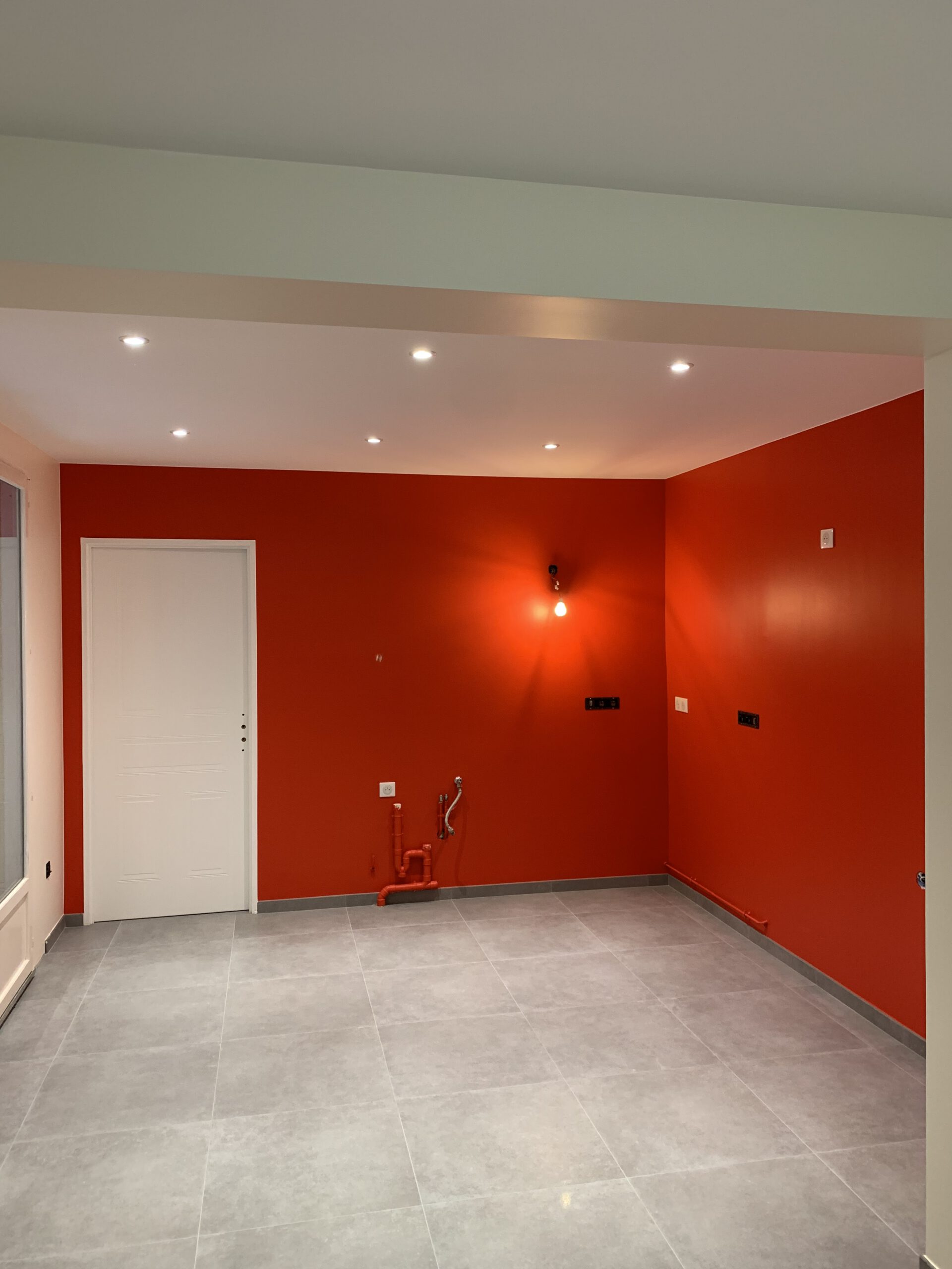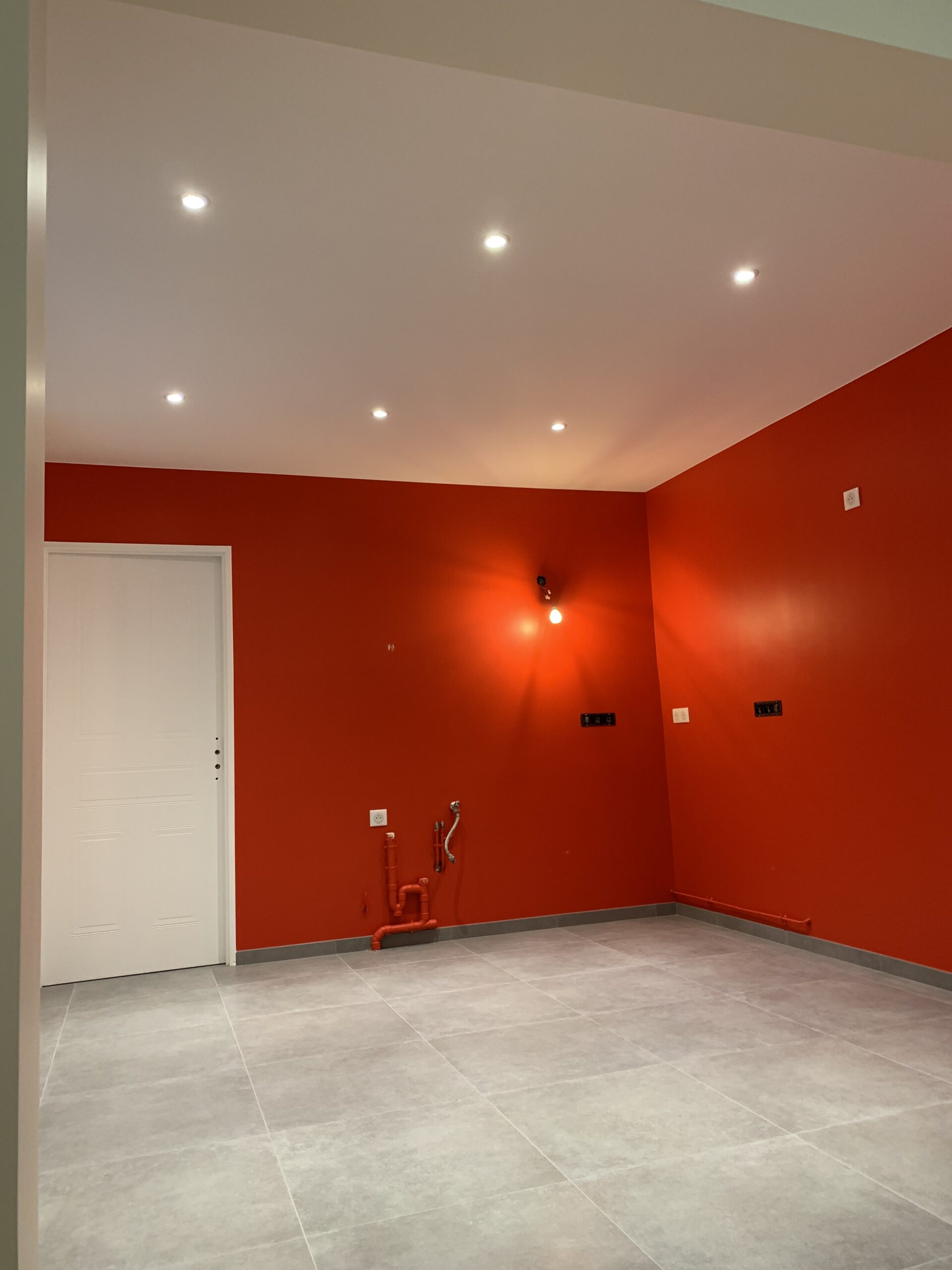 La simplicité est au cœur de notre approche. Le nouveau sol en carrelage gris offre une base neutre et moderne, tandis que le mur d’accent rouge vif injecte énergie et dynamisme, prouvant que des touches audacieuses peuvent coexister avec une esthétique minimaliste.