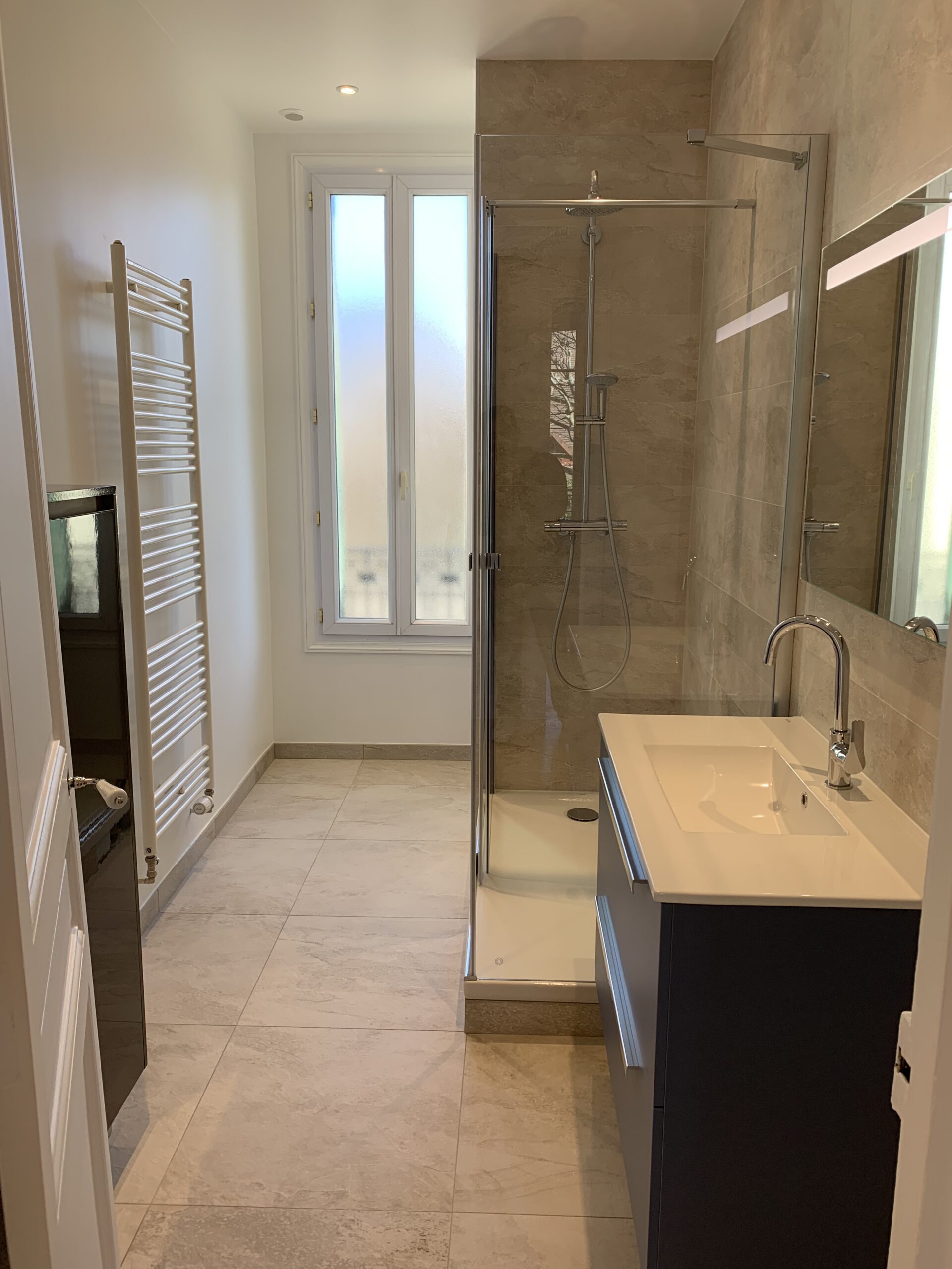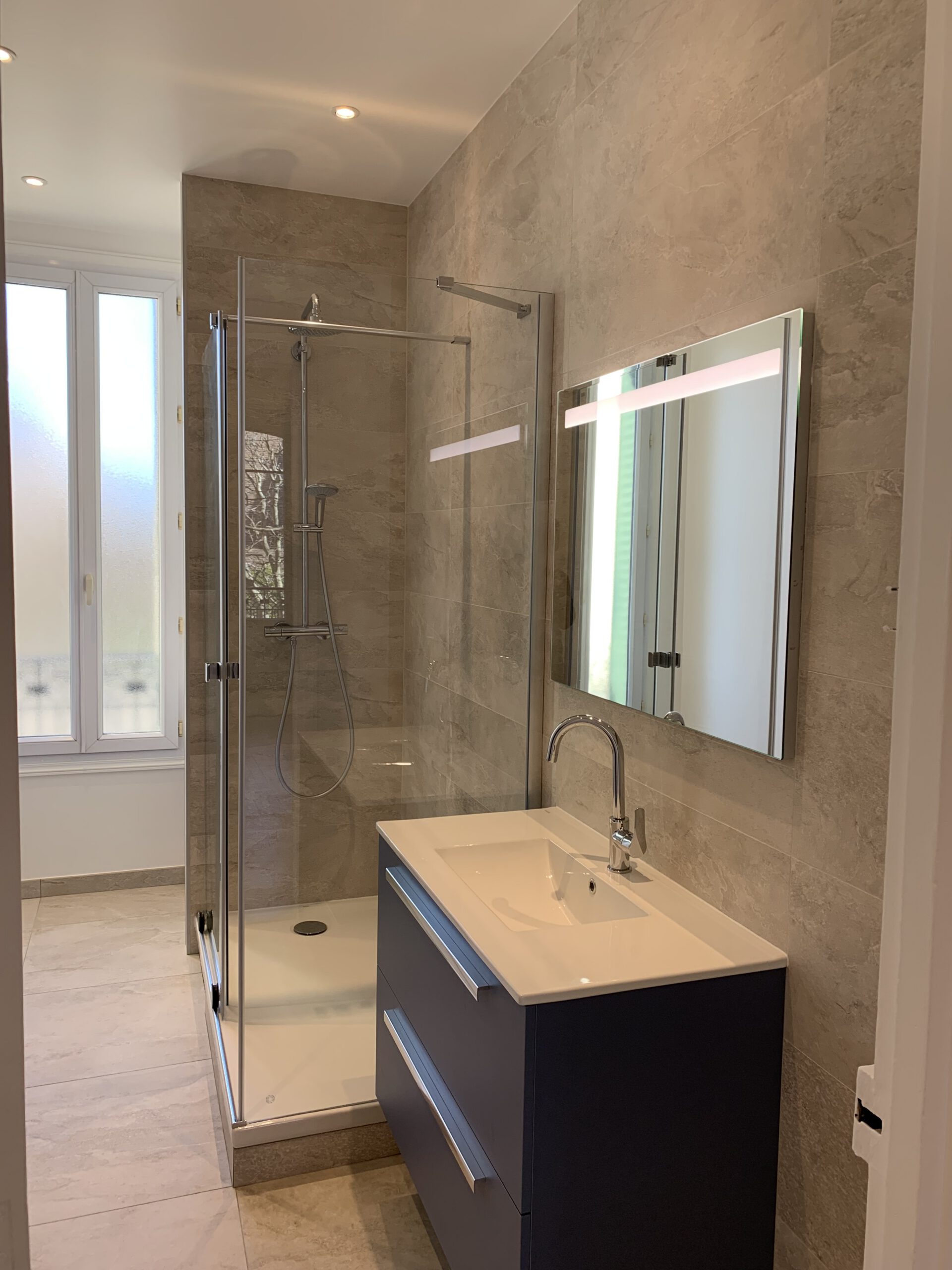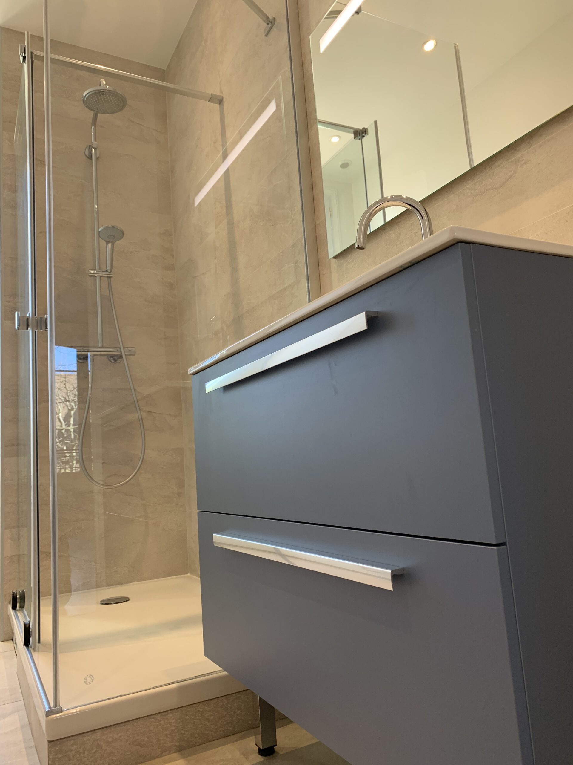 La salle de bain finie bénéficie d’un éclairage doux et de reflets qui agrandissent l’espace. Des miroirs bien placés et des points lumineux stratégiques apportent une sensation d’espace et de luminosité.
