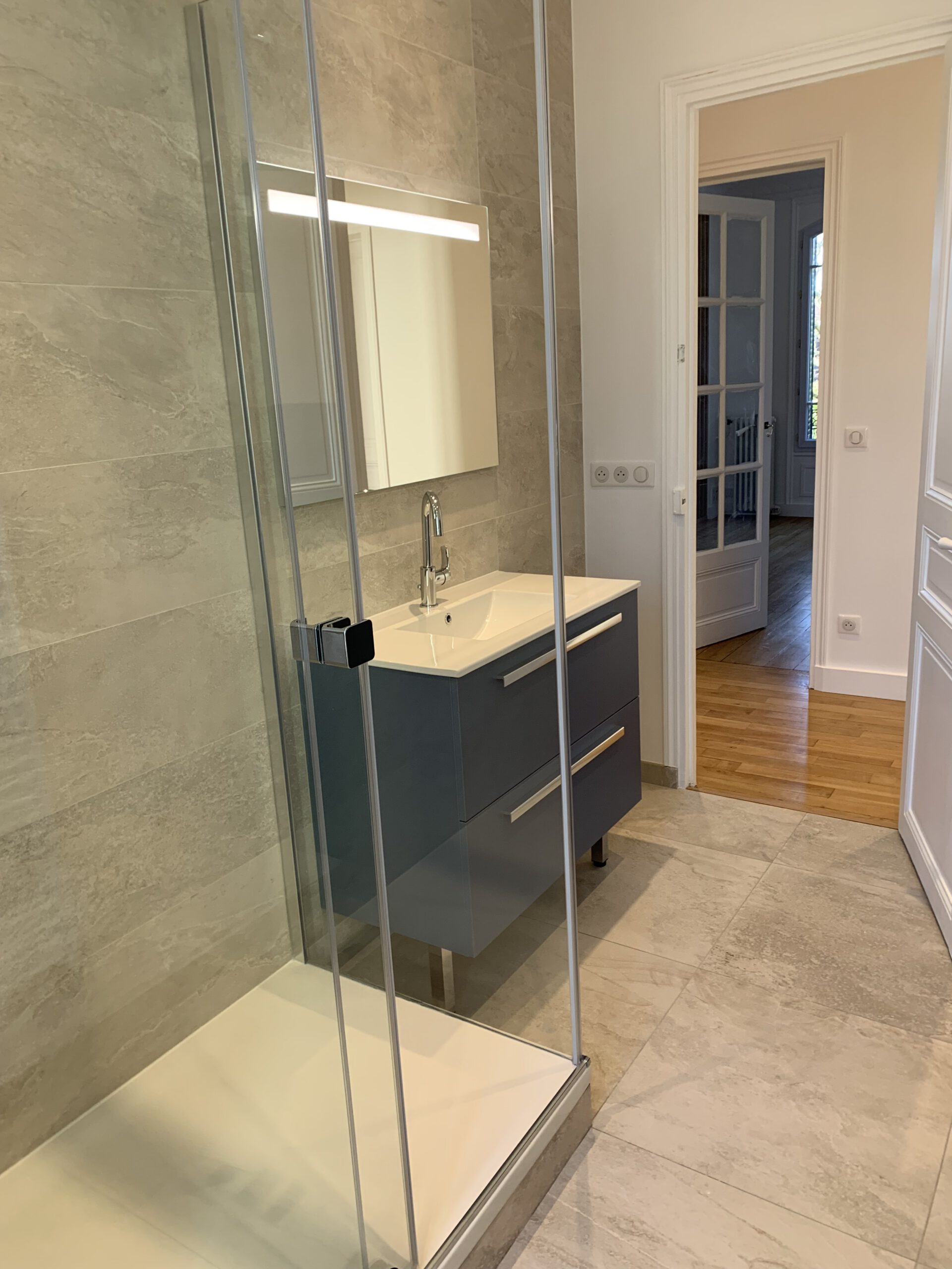 Le résultat est époustouflant : une salle de bain épurée et moderne, où chaque élément, du meuble-lavabo suspendu à la cabine de douche en verre, a été conçu pour créer une atmosphère de calme et de luxe.