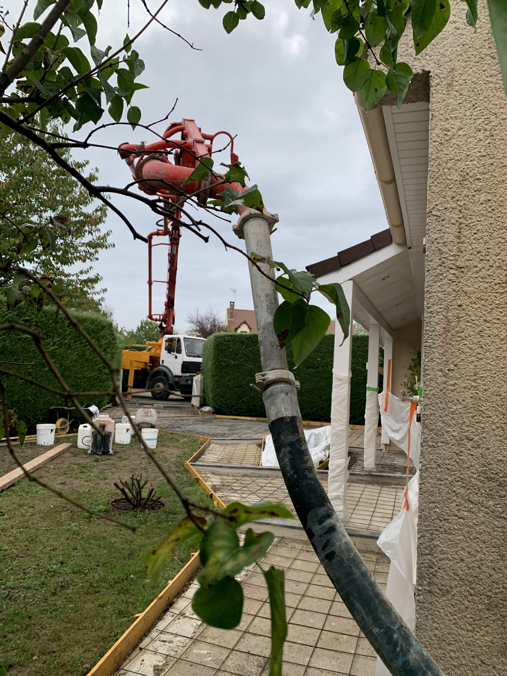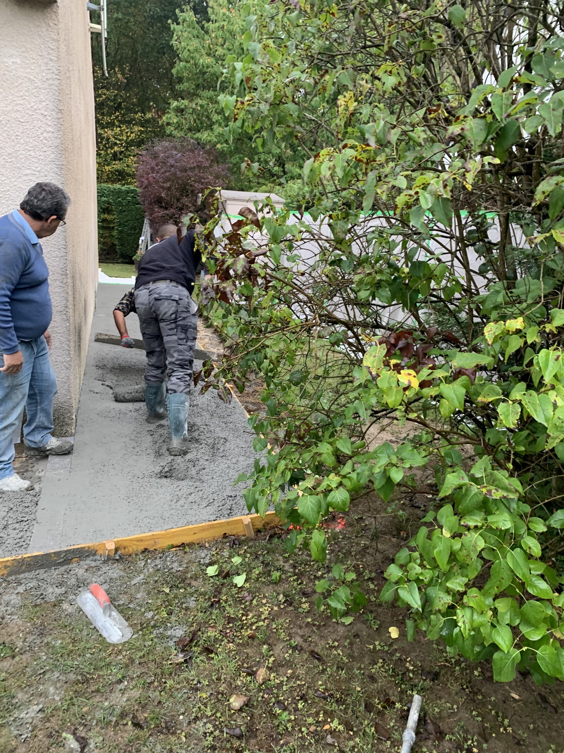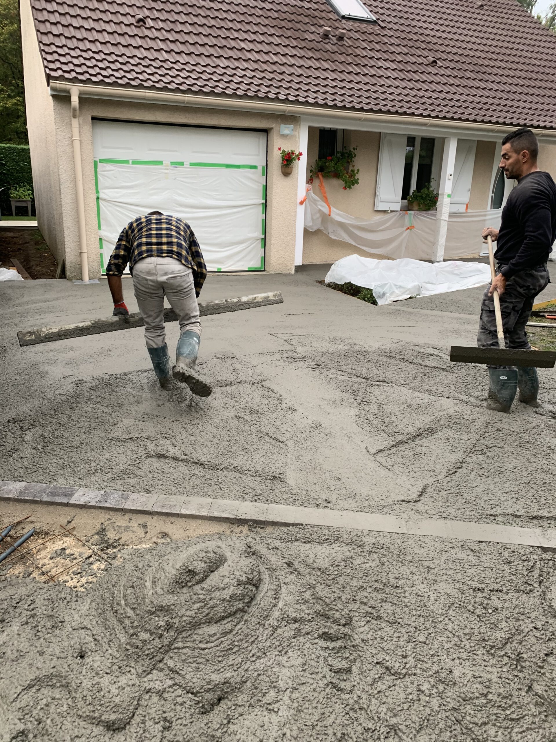Étape 3: Coulage du Béton Le béton a été coulé méticuleusement dans le coffrage, une étape exigeant précision et rapidité pour garantir une surface lisse et uniforme.