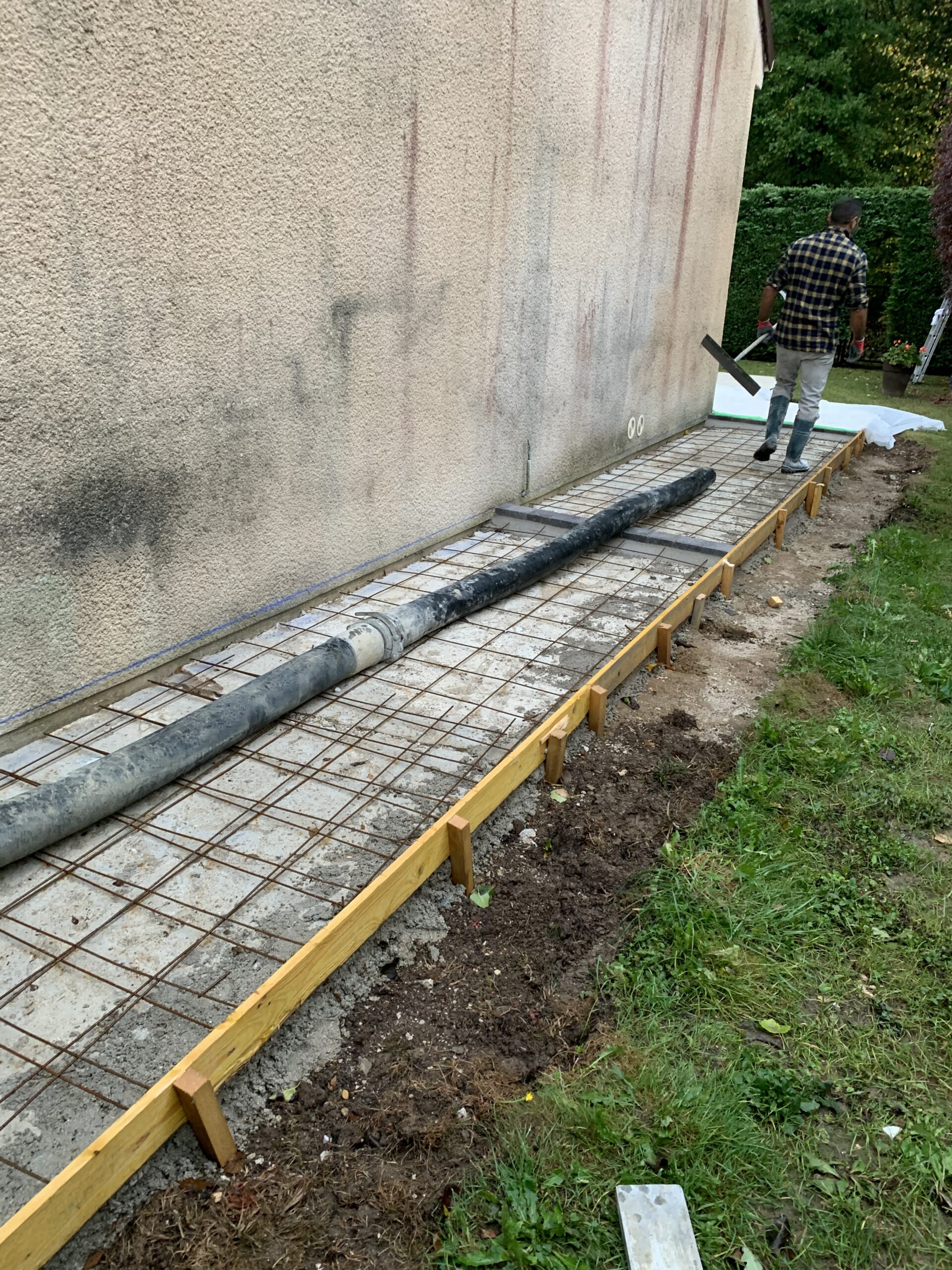 Étape 2: Coffrage et Armature Le coffrage a été mis en place pour délimiter la zone de la terrasse, suivi par l’installation d’une armature métallique. Cette étape est cruciale pour renforcer la structure du béton.