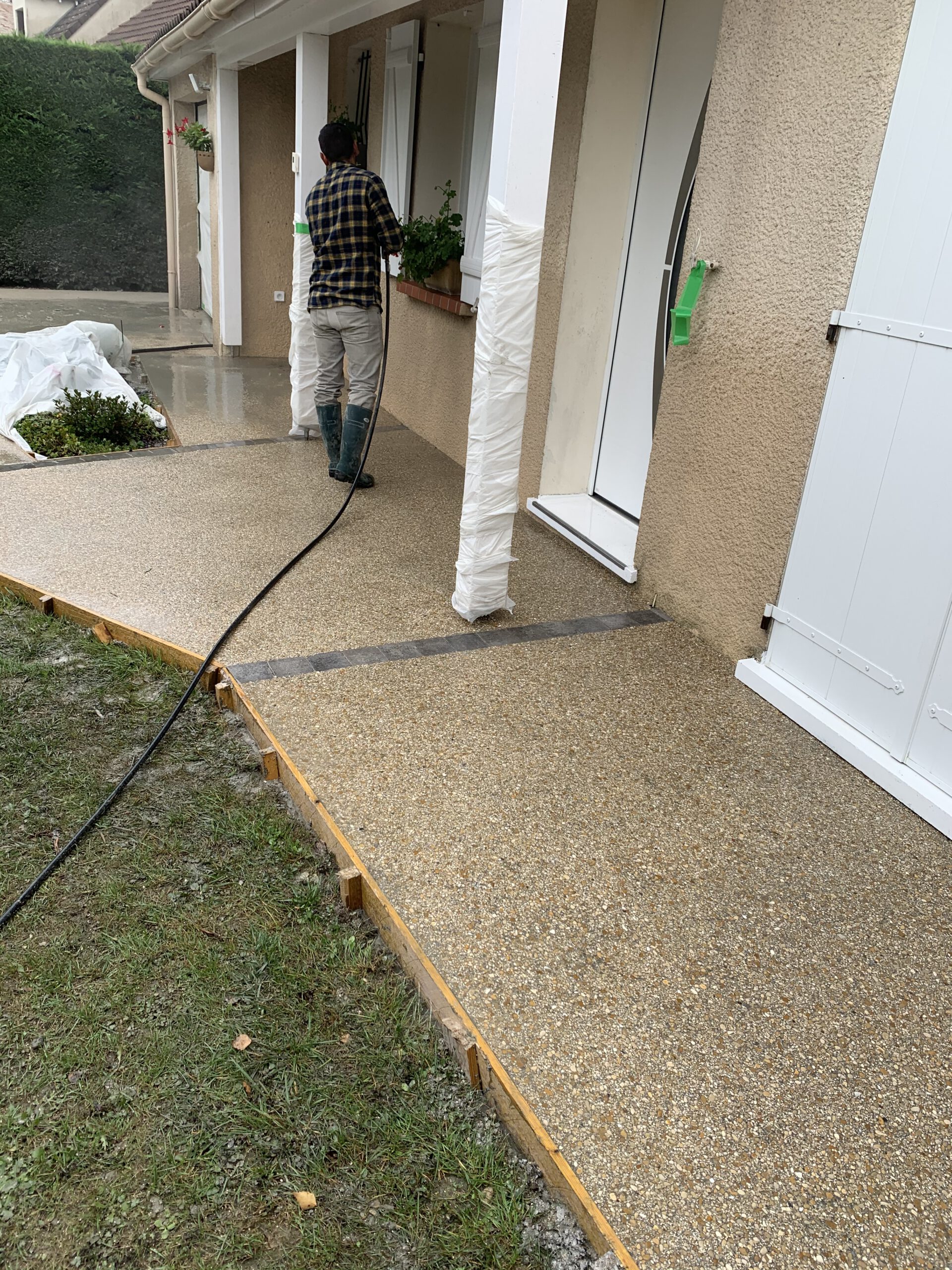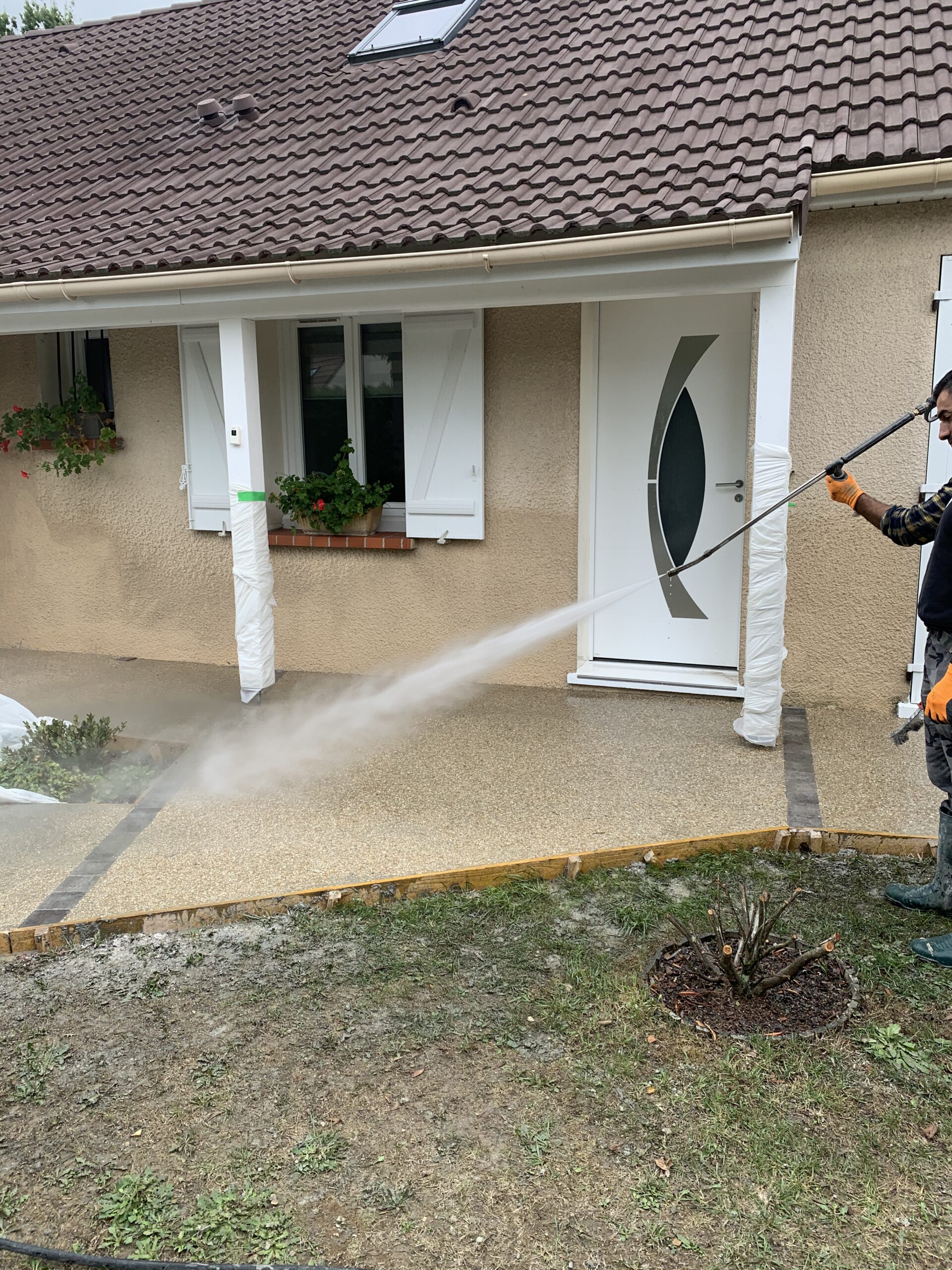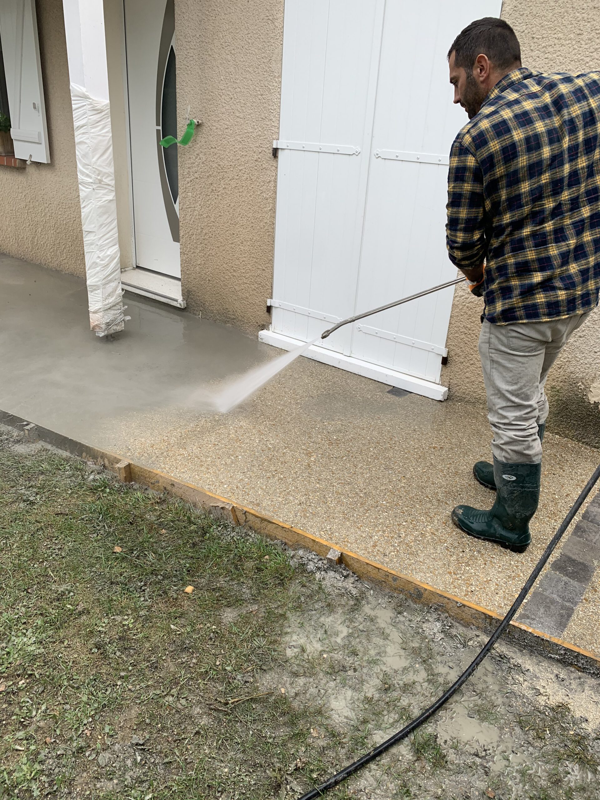 Étape 5: Révélation et Lavage Une fois le béton partiellement durci, nous avons lavé la surface à l’eau haute pression. Cette action a révélé les granulats colorés, créant cet aspect unique et personnalisable du béton désactivé.