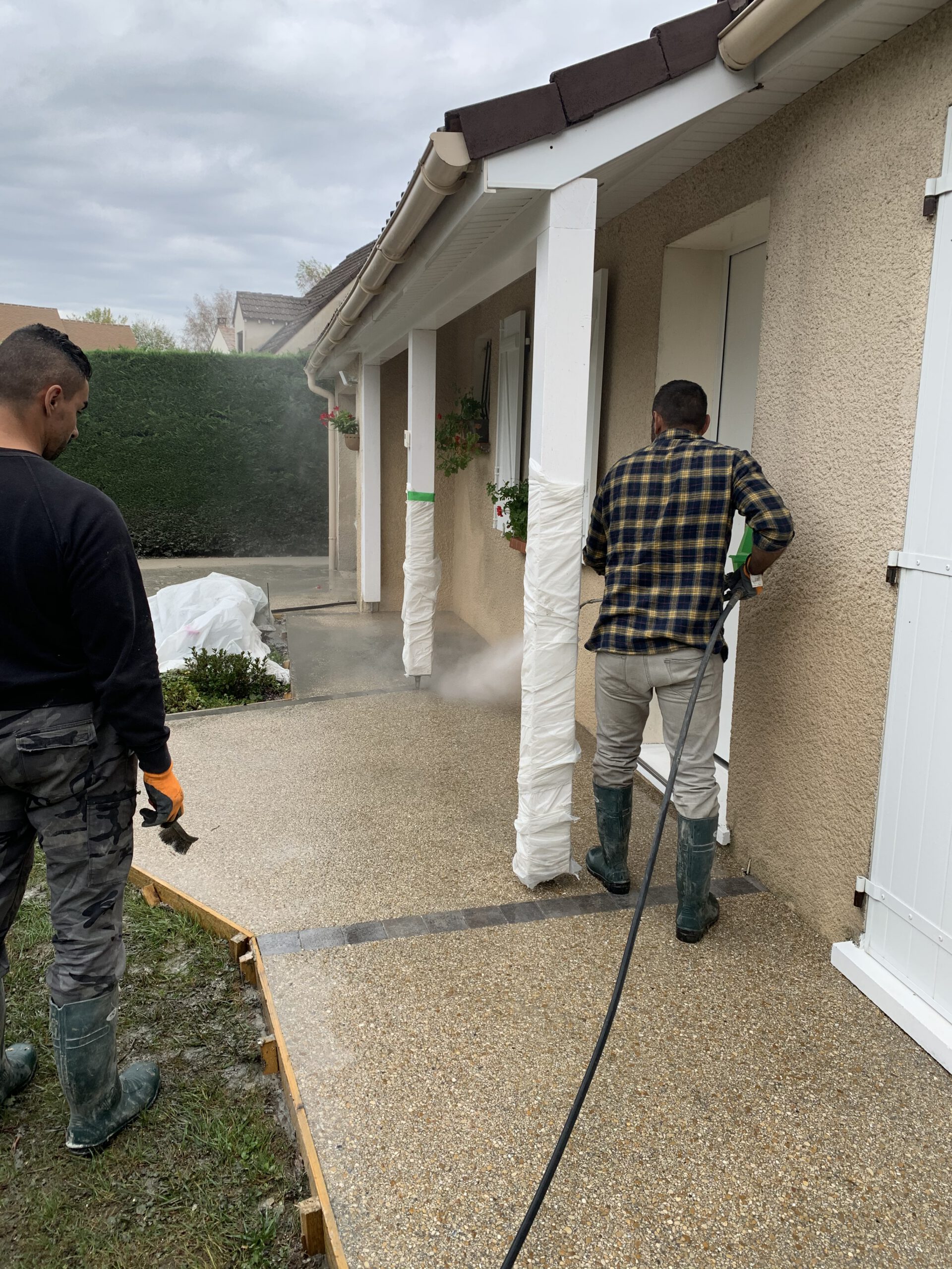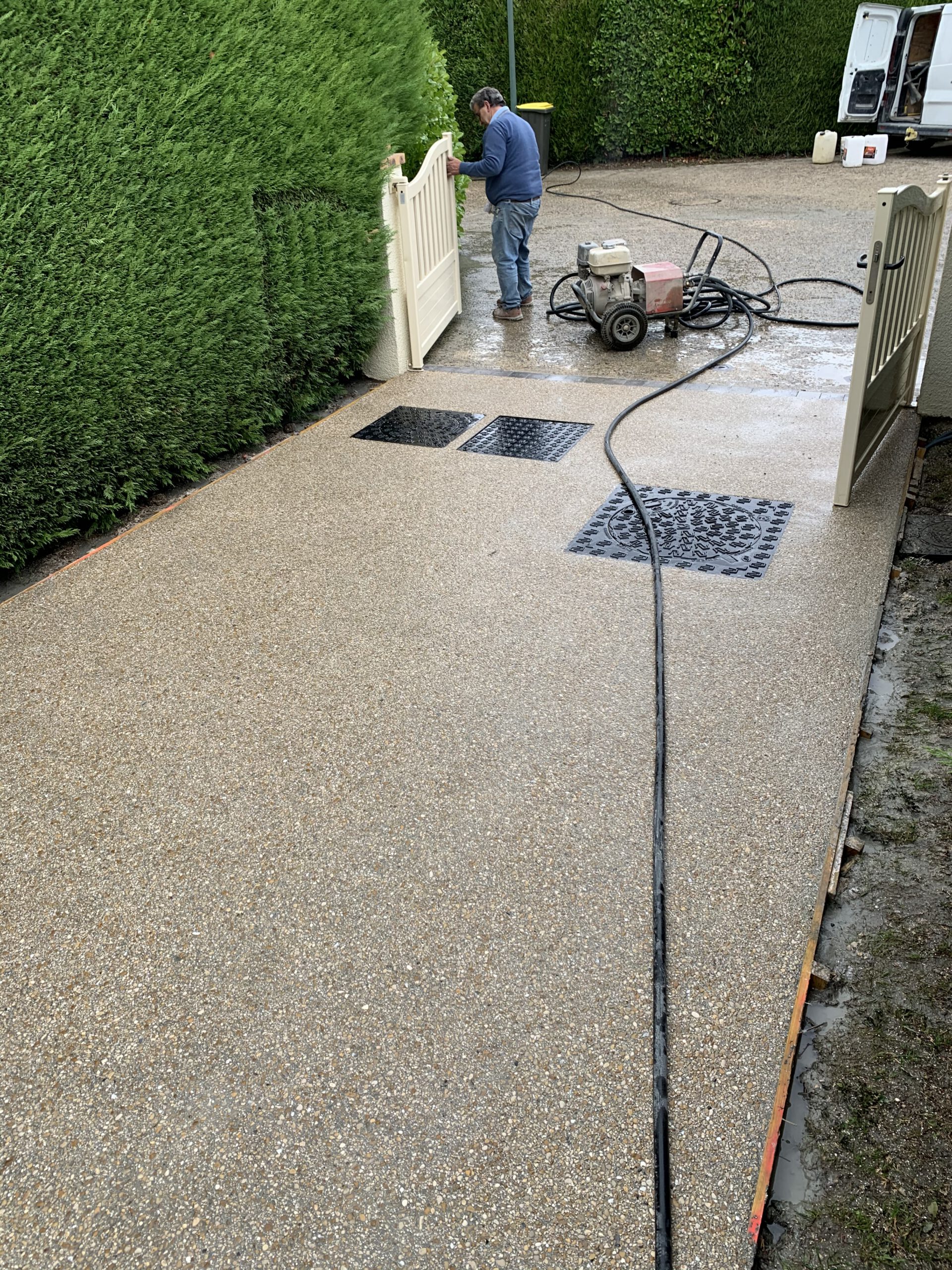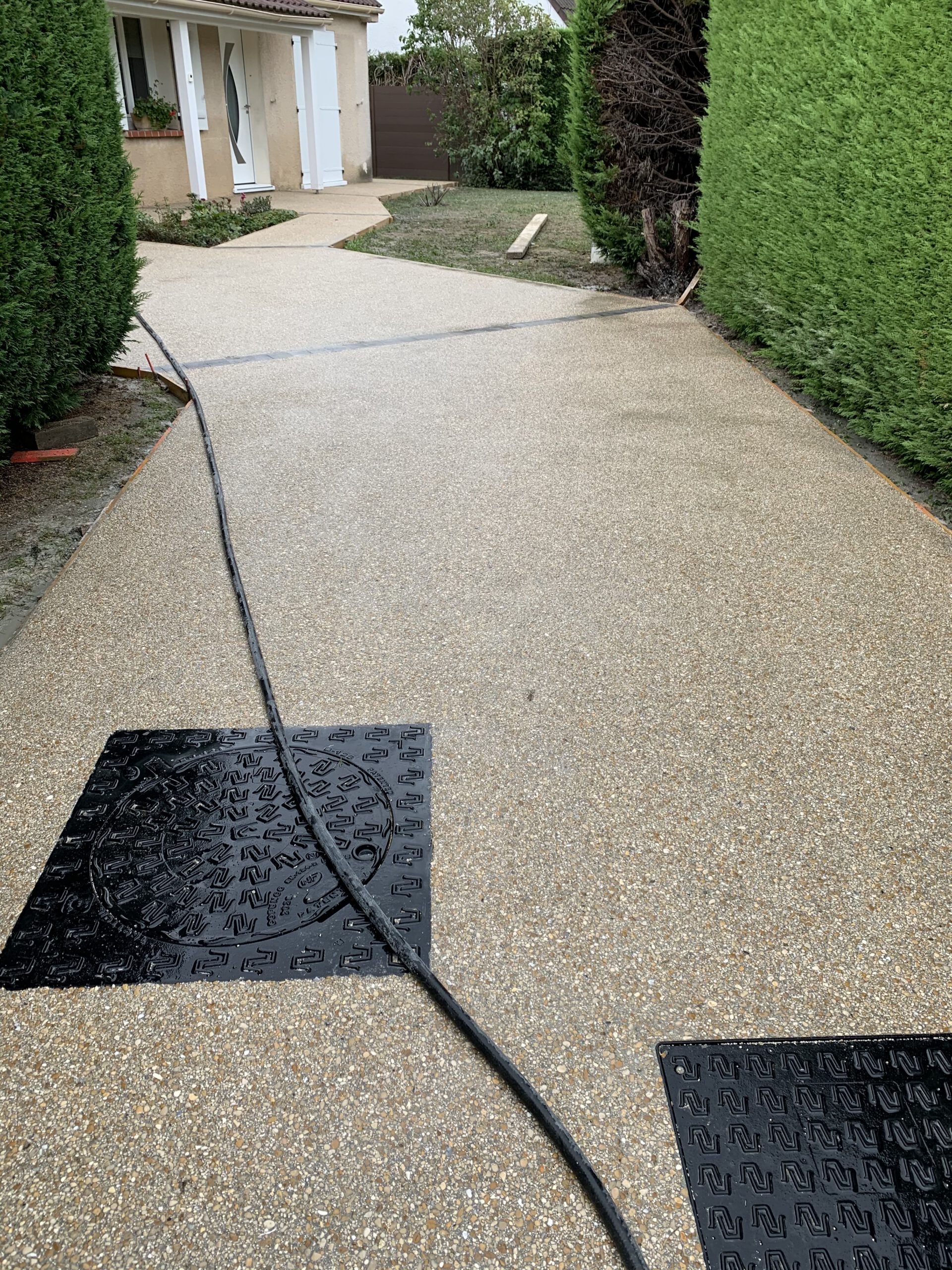 Étape 5: Révélation et Lavage Une fois le béton partiellement durci, nous avons lavé la surface à l’eau haute pression. Cette action a révélé les granulats colorés, créant cet aspect unique et personnalisable du béton désactivé.